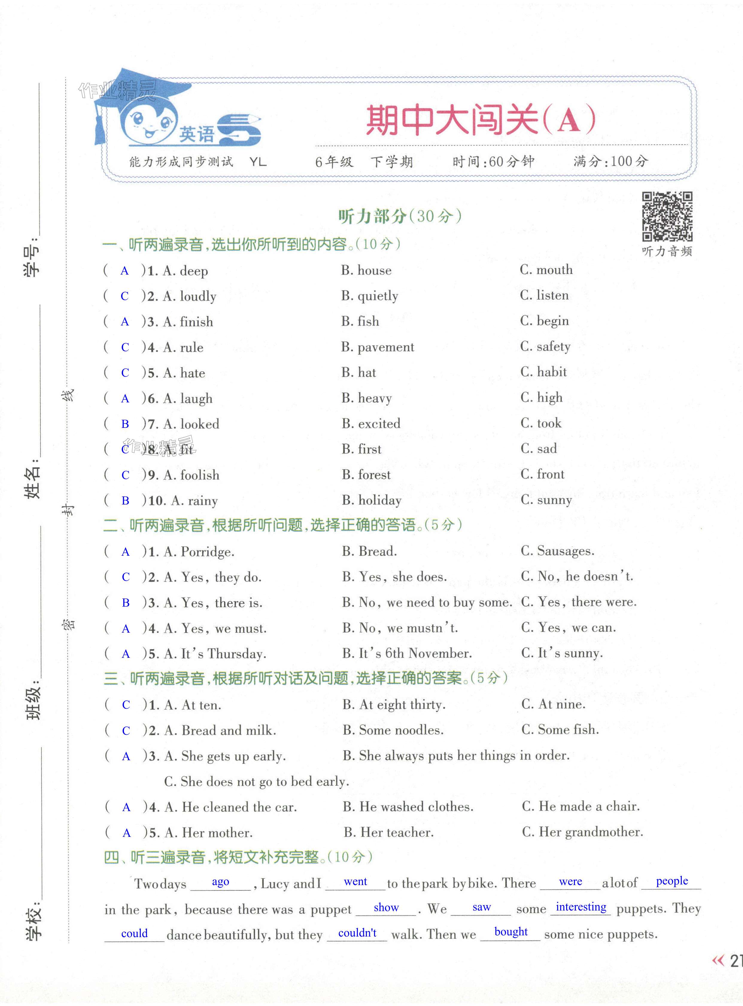 注:目前有些书本章节名称可能整理的还不是很完善,但都是按照顺序排列的,请同学们按照顺序仔细查找。练习册 2024年能力形成同步测试六年级英语下册译林版 答案主要是用来给同学们做完题方便对答案用的,请勿直接抄袭。