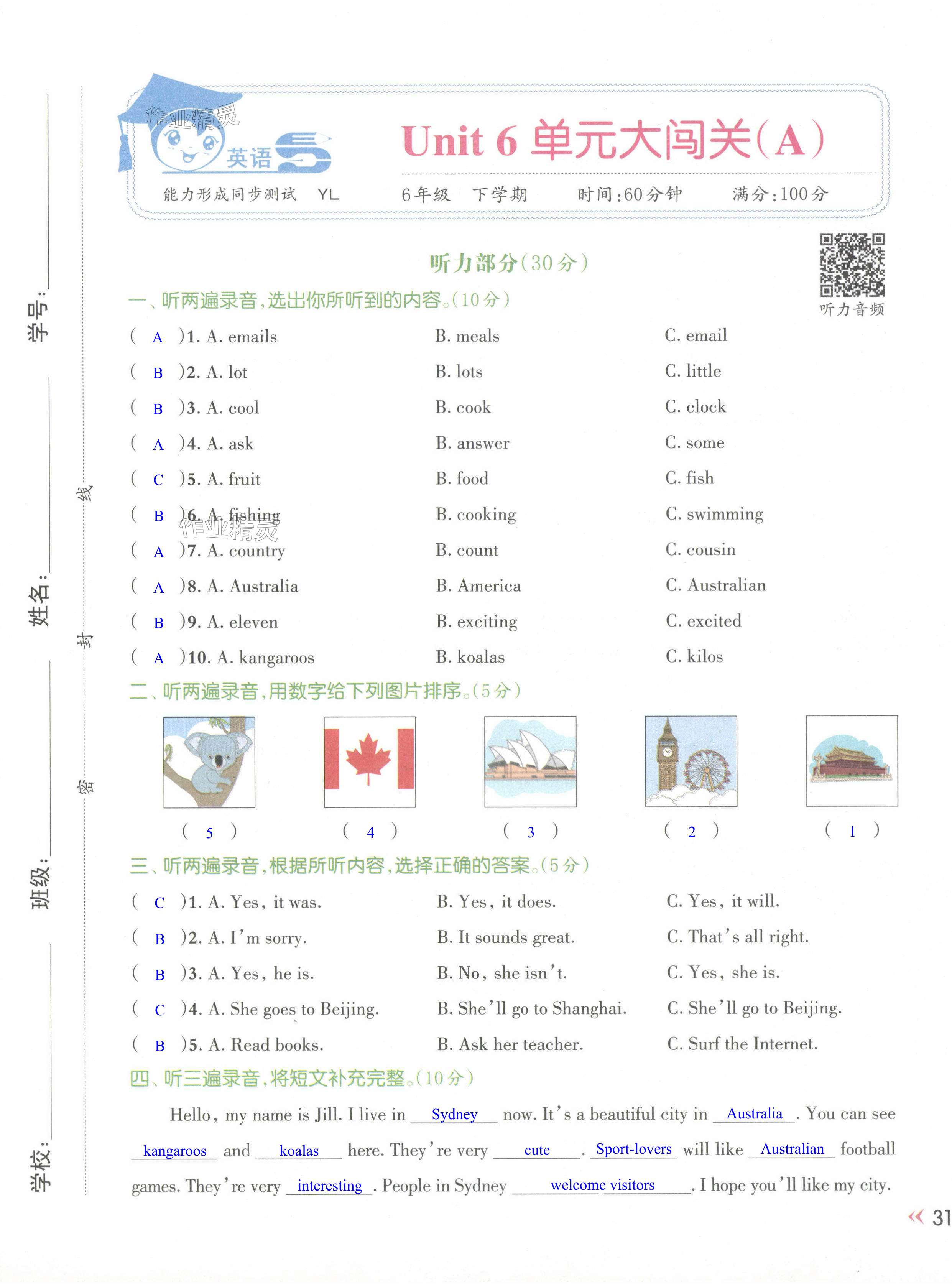 注:目前有些书本章节名称可能整理的还不是很完善,但都是按照顺序排列的,请同学们按照顺序仔细查找。练习册 2024年能力形成同步测试六年级英语下册译林版 答案主要是用来给同学们做完题方便对答案用的,请勿直接抄袭。