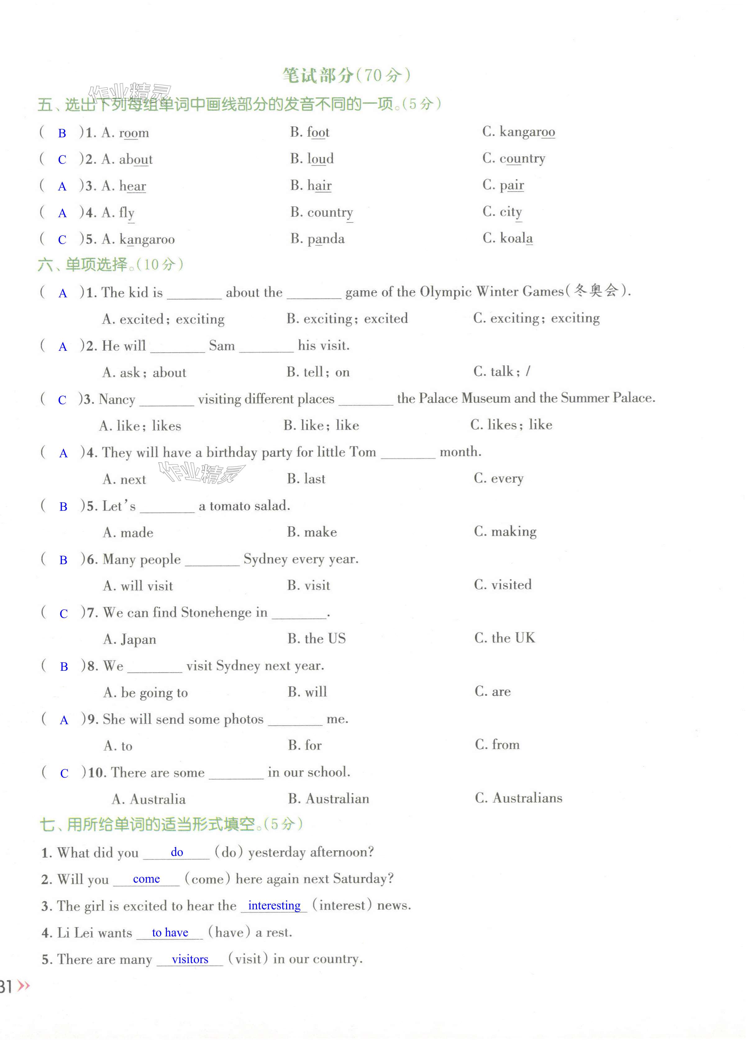 注:目前有些书本章节名称可能整理的还不是很完善,但都是按照顺序排列的,请同学们按照顺序仔细查找。练习册 2024年能力形成同步测试六年级英语下册译林版 答案主要是用来给同学们做完题方便对答案用的,请勿直接抄袭。