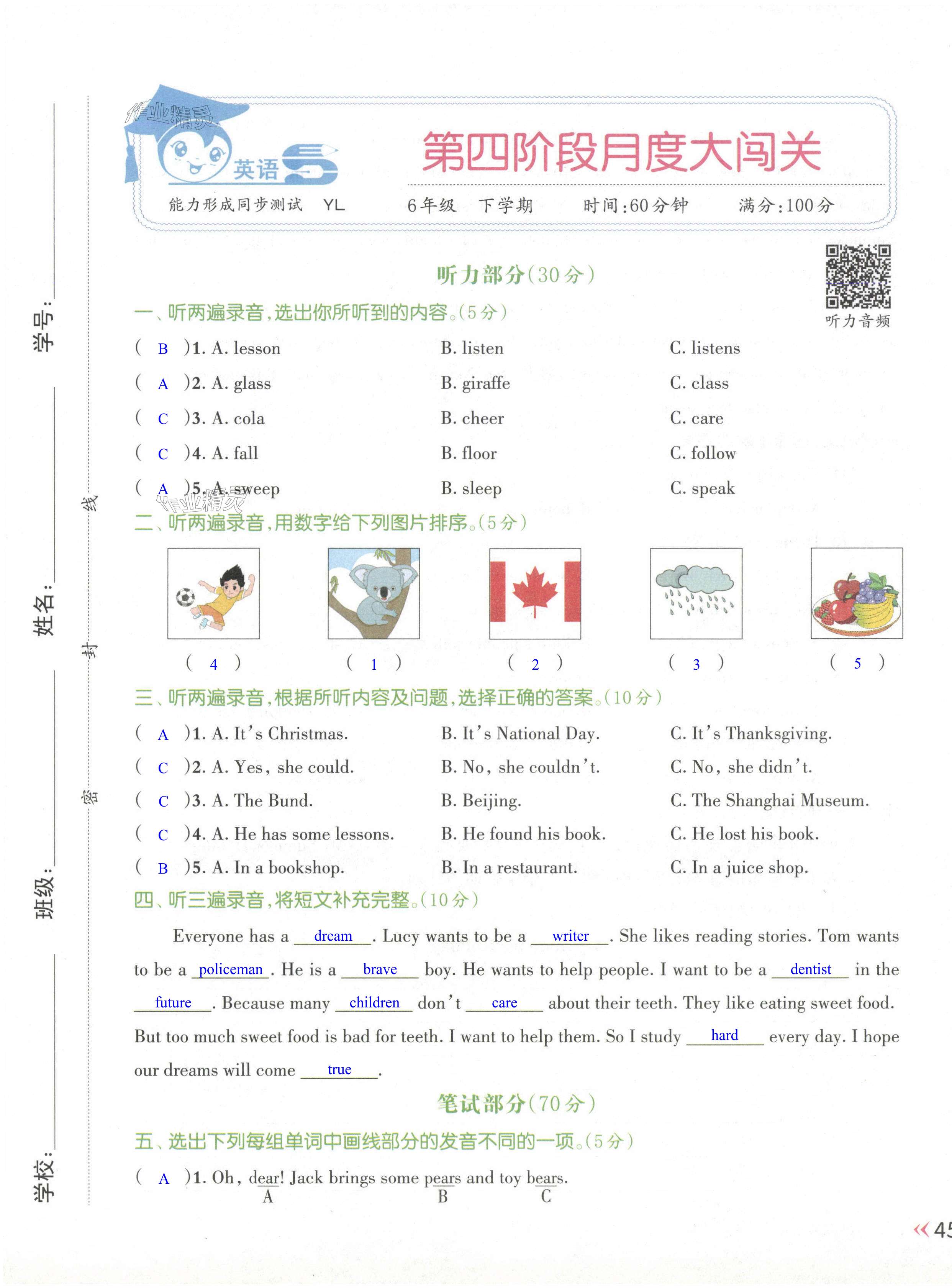 注:目前有些书本章节名称可能整理的还不是很完善,但都是按照顺序排列的,请同学们按照顺序仔细查找。练习册 2024年能力形成同步测试六年级英语下册译林版 答案主要是用来给同学们做完题方便对答案用的,请勿直接抄袭。