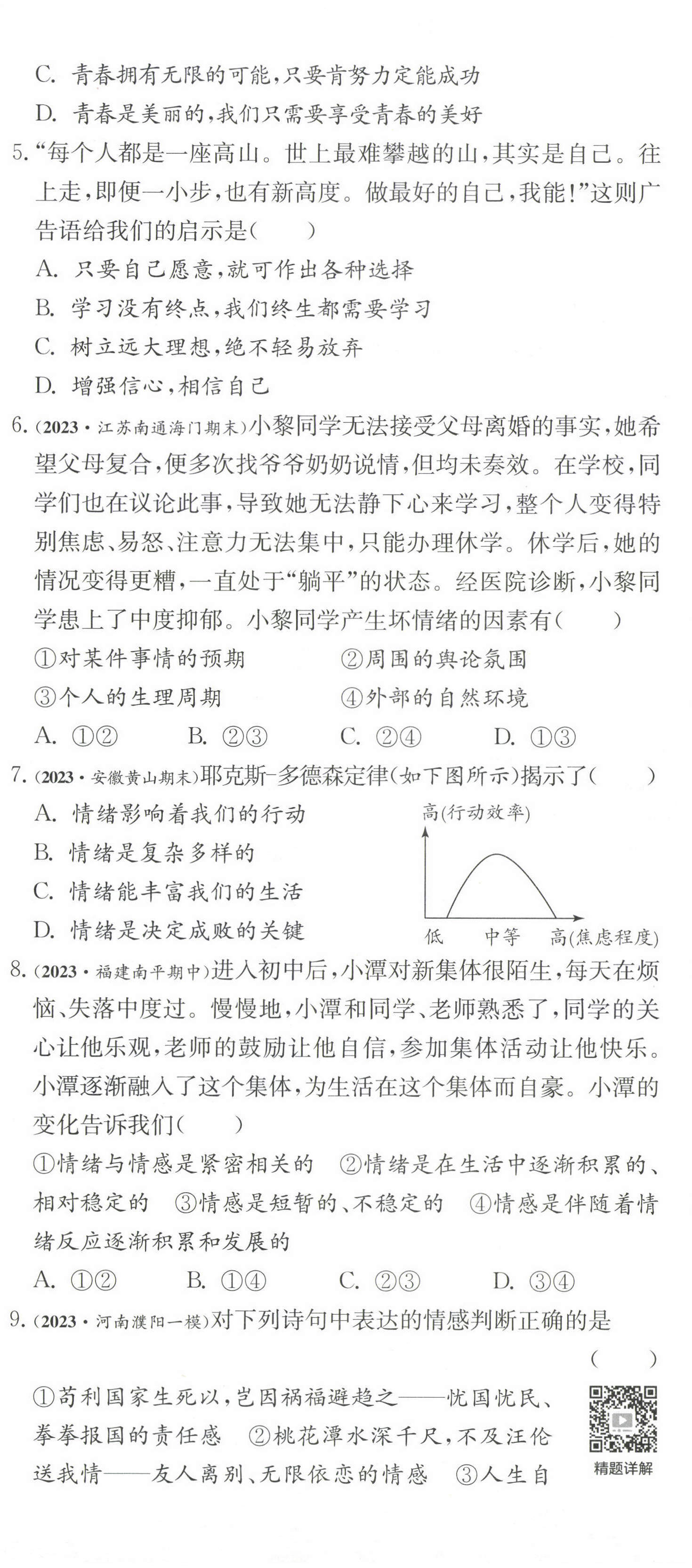 注:目前有些书本章节名称可能整理的还不是很完善,但都是按照顺序排列的,请同学们按照顺序仔细查找。练习册 2024年1课3练单元达标测试七年级道德与法治下册人教版 答案主要是用来给同学们做完题方便对答案用的,请勿直接抄袭。