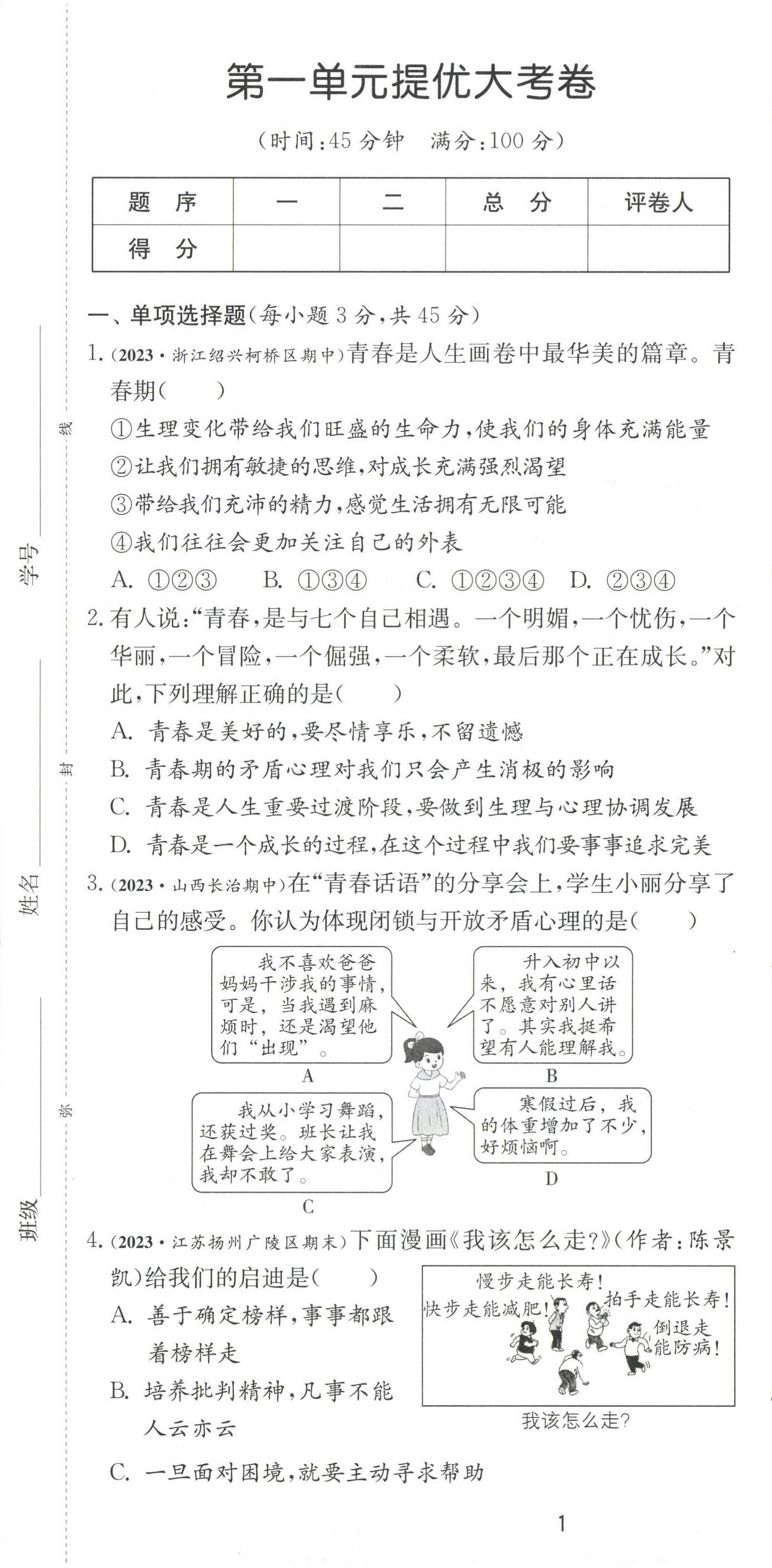 注:目前有些书本章节名称可能整理的还不是很完善,但都是按照顺序排列的,请同学们按照顺序仔细查找。练习册 2024年1课3练单元达标测试七年级道德与法治下册人教版 答案主要是用来给同学们做完题方便对答案用的,请勿直接抄袭。