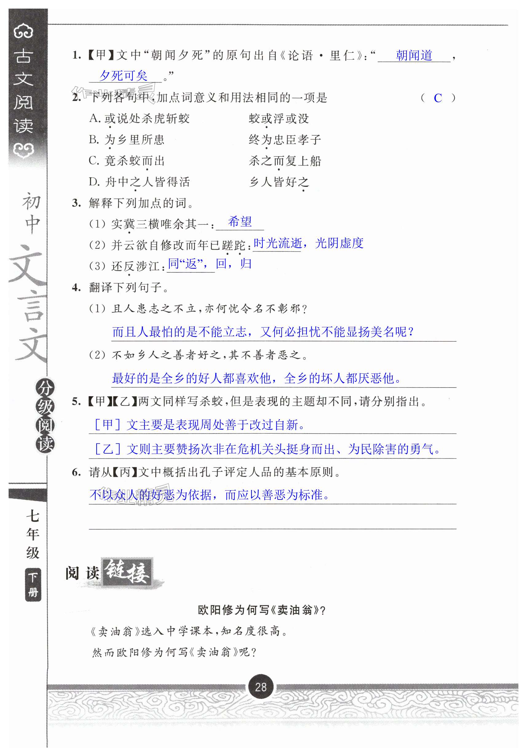 注:目前有些书本章节名称可能整理的还不是很完善,但都是按照顺序排列的,请同学们按照顺序仔细查找。练习册 2024年初中文言文分级阅读七年级下册 答案主要是用来给同学们做完题方便对答案用的,请勿直接抄袭。