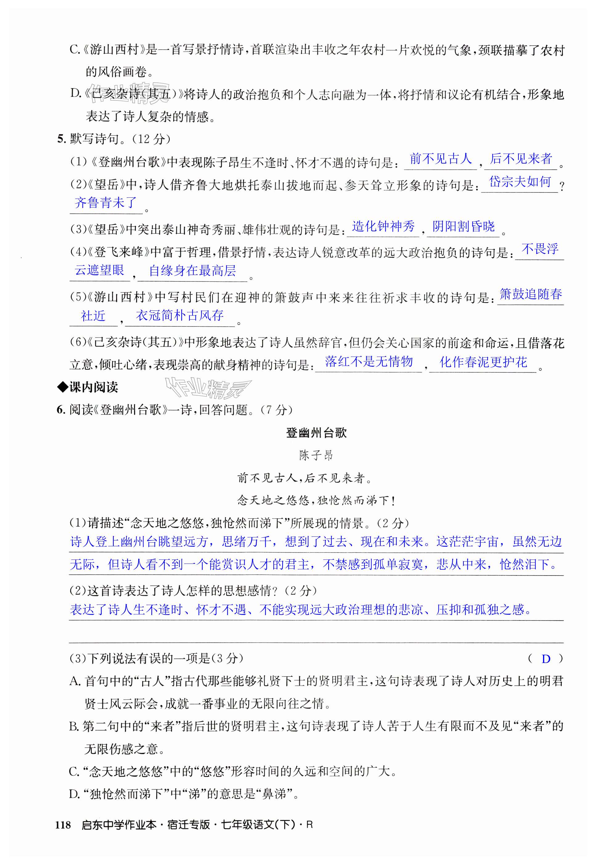 注:目前有些书本章节名称可能整理的还不是很完善,但都是按照顺序排列的,请同学们按照顺序仔细查找。练习册 2024年启东中学作业本七年级语文下册人教版宿迁专版 答案主要是用来给同学们做完题方便对答案用的,请勿直接抄袭。