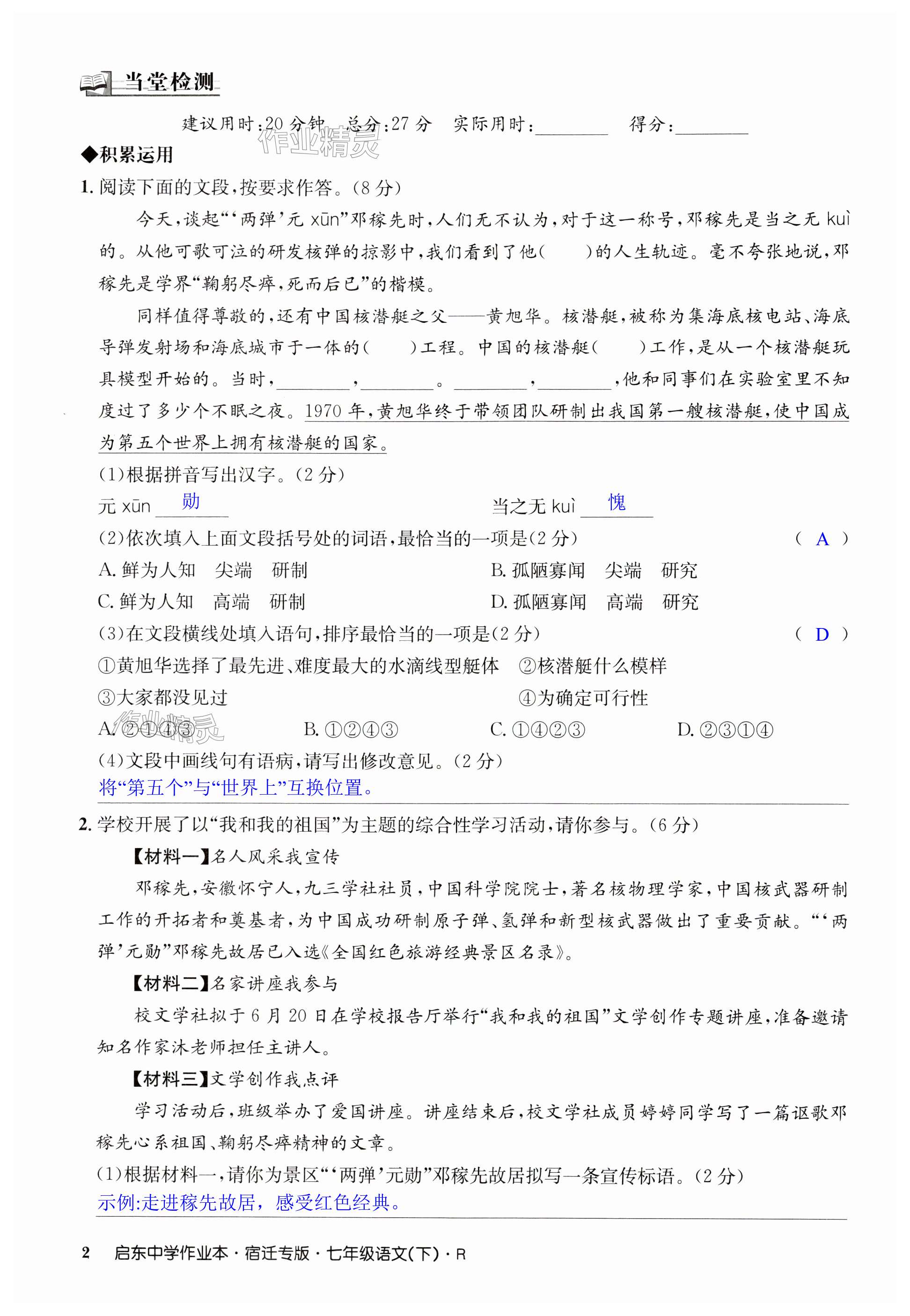 《2024年启东中学作业本七年级语文下册人教版宿迁专版》