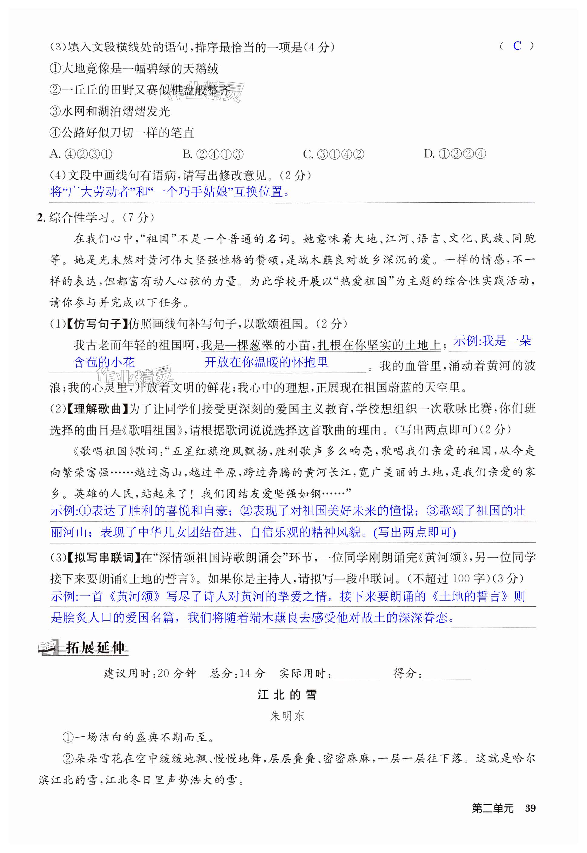 注:目前有些书本章节名称可能整理的还不是很完善,但都是按照顺序排列的,请同学们按照顺序仔细查找。练习册 2024年启东中学作业本七年级语文下册人教版宿迁专版 答案主要是用来给同学们做完题方便对答案用的,请勿直接抄袭。