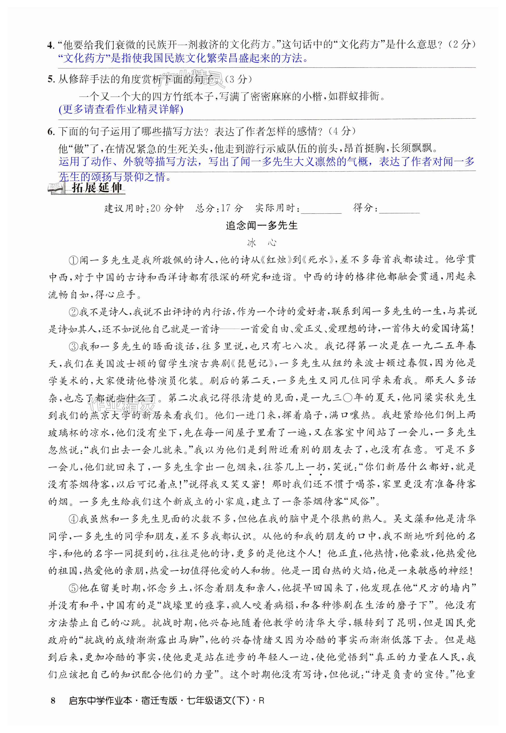 注:目前有些书本章节名称可能整理的还不是很完善,但都是按照顺序排列的,请同学们按照顺序仔细查找。练习册 2024年启东中学作业本七年级语文下册人教版宿迁专版 答案主要是用来给同学们做完题方便对答案用的,请勿直接抄袭。