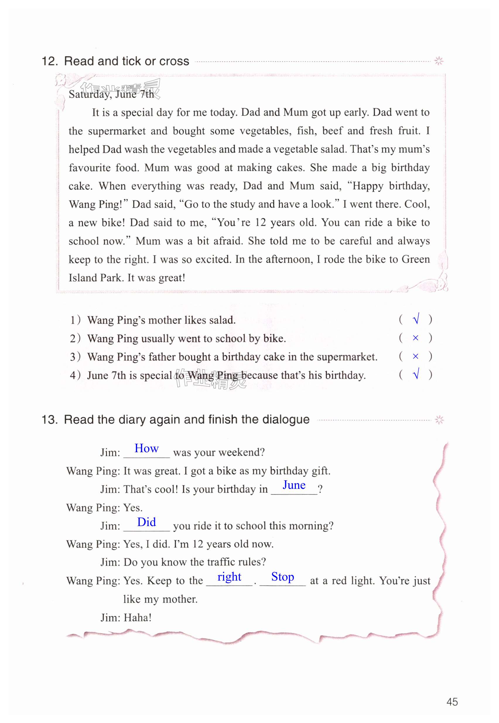 注:目前有些书本章节名称可能整理的还不是很完善,但都是按照顺序排列的,请同学们按照顺序仔细查找。练习册 2024年作业本浙江教育出版社六年级英语下册人教版 答案主要是用来给同学们做完题方便对答案用的,请勿直接抄袭。