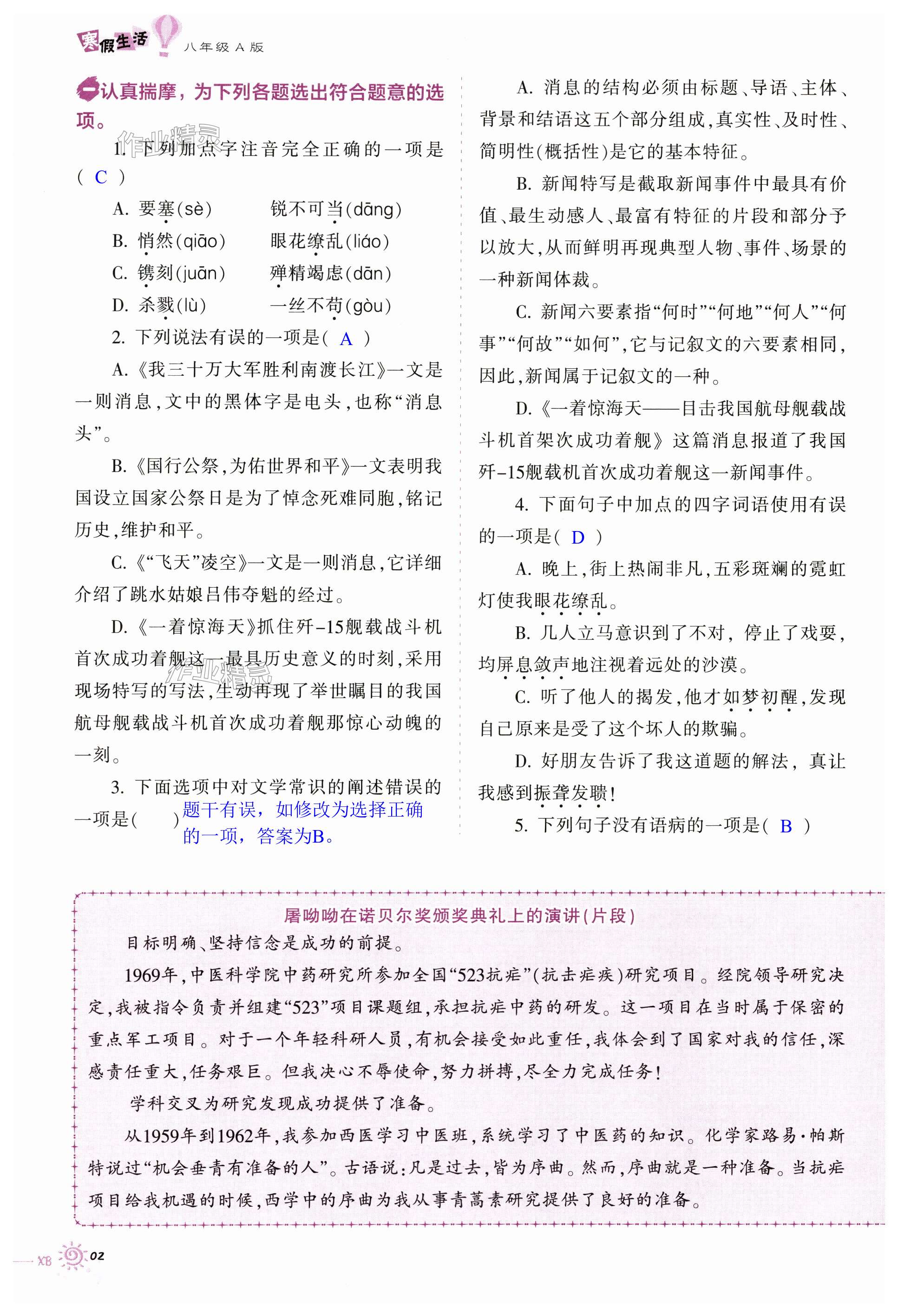 注:目前有些书本章节名称可能整理的还不是很完善,但都是按照顺序排列的,请同学们按照顺序仔细查找。练习册 2024年寒假生活八年级A版重庆出版社 答案主要是用来给同学们做完题方便对答案用的,请勿直接抄袭。