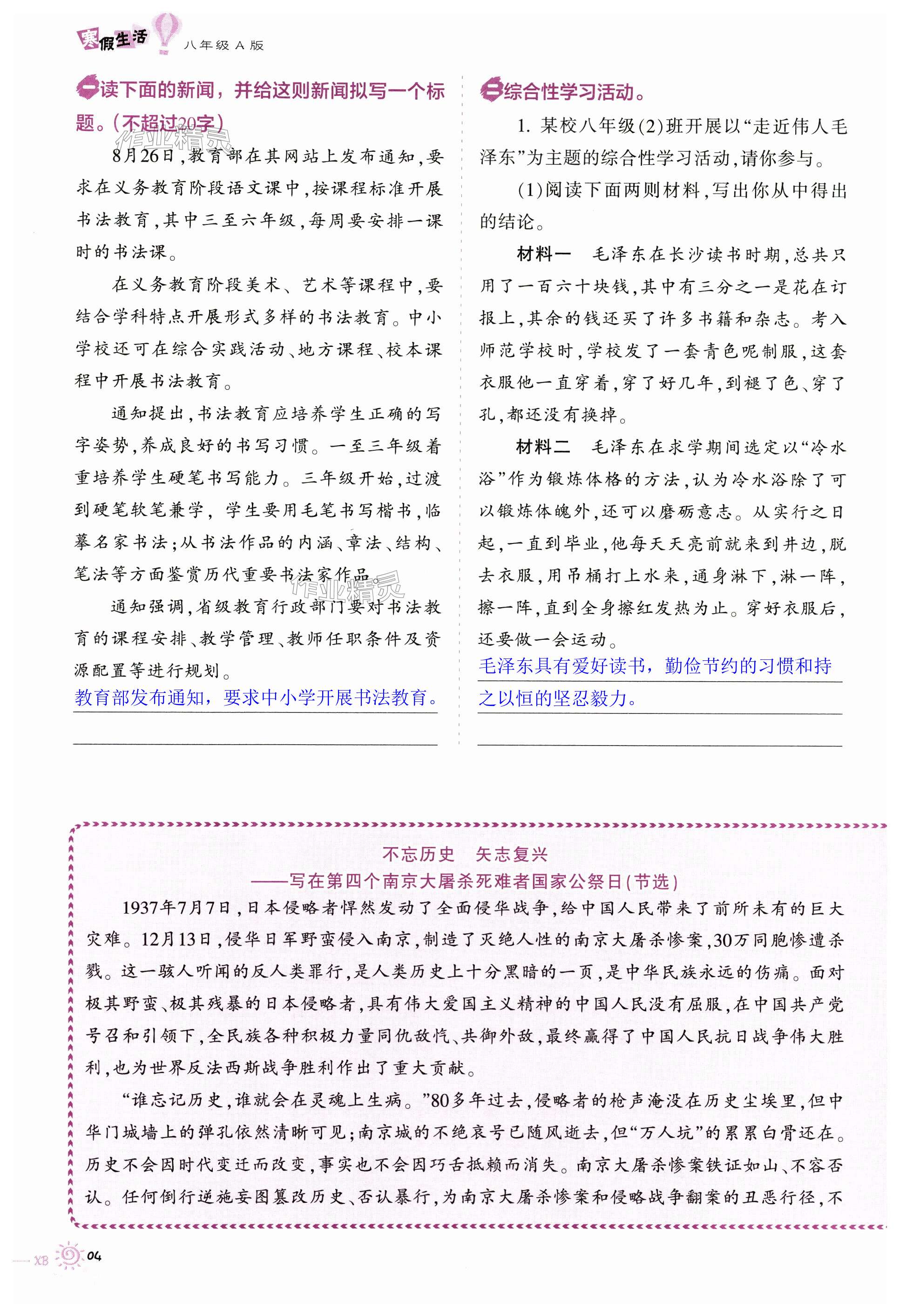 注:目前有些书本章节名称可能整理的还不是很完善,但都是按照顺序排列的,请同学们按照顺序仔细查找。练习册 2024年寒假生活八年级A版重庆出版社 答案主要是用来给同学们做完题方便对答案用的,请勿直接抄袭。