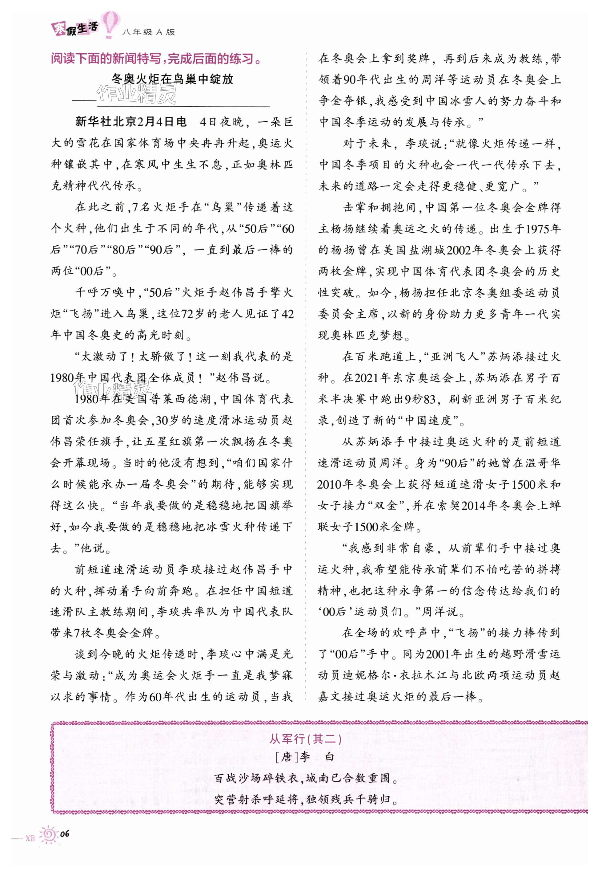 注:目前有些书本章节名称可能整理的还不是很完善,但都是按照顺序排列的,请同学们按照顺序仔细查找。练习册 2024年寒假生活八年级A版重庆出版社 答案主要是用来给同学们做完题方便对答案用的,请勿直接抄袭。