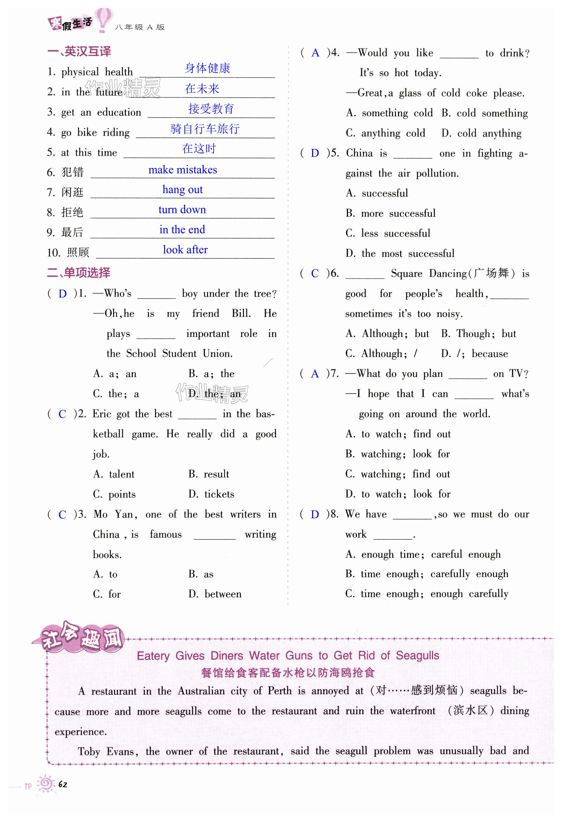 注:目前有些书本章节名称可能整理的还不是很完善,但都是按照顺序排列的,请同学们按照顺序仔细查找。练习册 2024年寒假生活八年级A版重庆出版社 答案主要是用来给同学们做完题方便对答案用的,请勿直接抄袭。