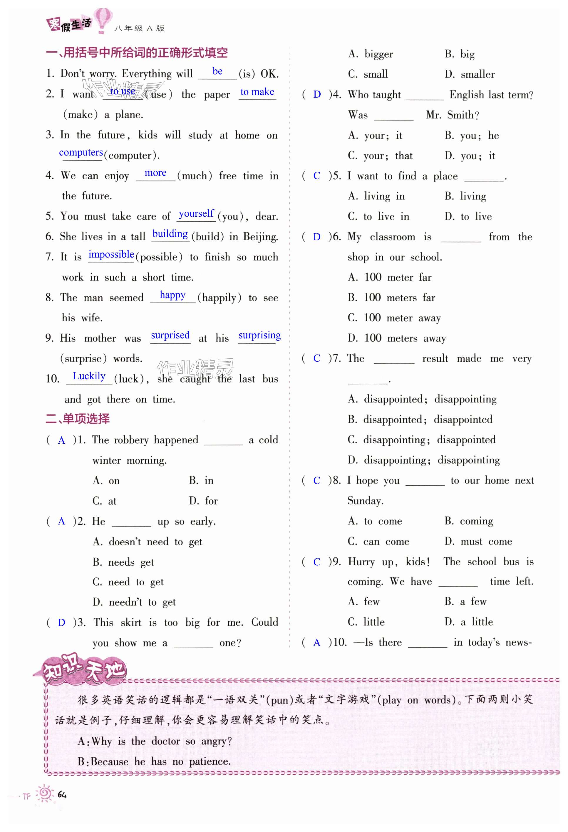 注:目前有些书本章节名称可能整理的还不是很完善,但都是按照顺序排列的,请同学们按照顺序仔细查找。练习册 2024年寒假生活八年级A版重庆出版社 答案主要是用来给同学们做完题方便对答案用的,请勿直接抄袭。