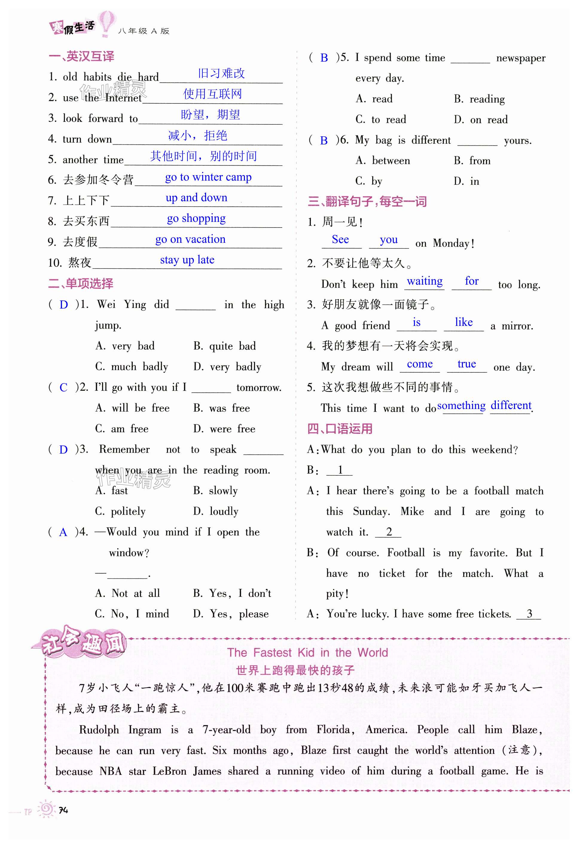 注:目前有些书本章节名称可能整理的还不是很完善,但都是按照顺序排列的,请同学们按照顺序仔细查找。练习册 2024年寒假生活八年级A版重庆出版社 答案主要是用来给同学们做完题方便对答案用的,请勿直接抄袭。