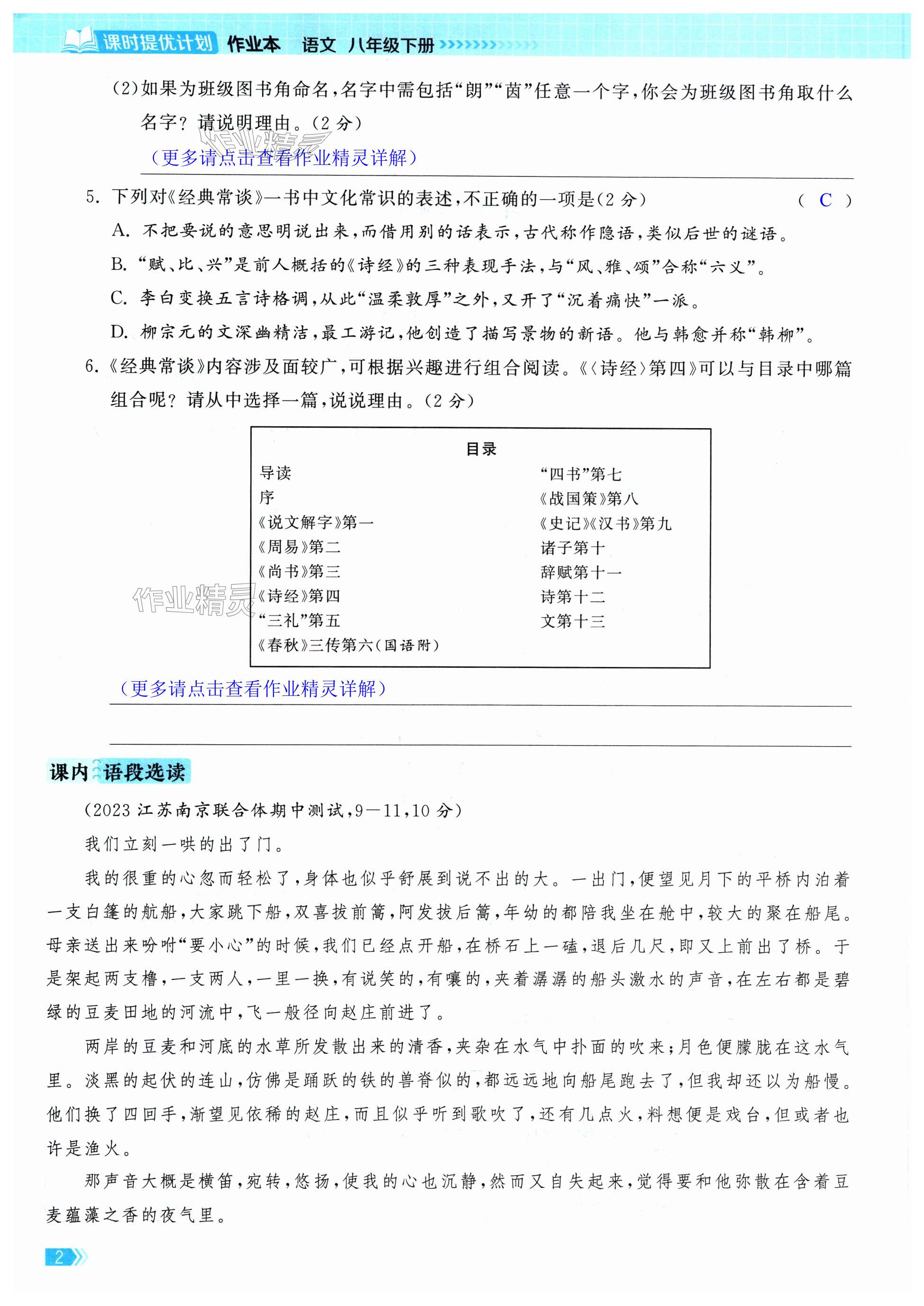 注:目前有些书本章节名称可能整理的还不是很完善,但都是按照顺序排列的,请同学们按照顺序仔细查找。练习册 2024年课时提优计划作业本八年级语文下册人教版 答案主要是用来给同学们做完题方便对答案用的,请勿直接抄袭。