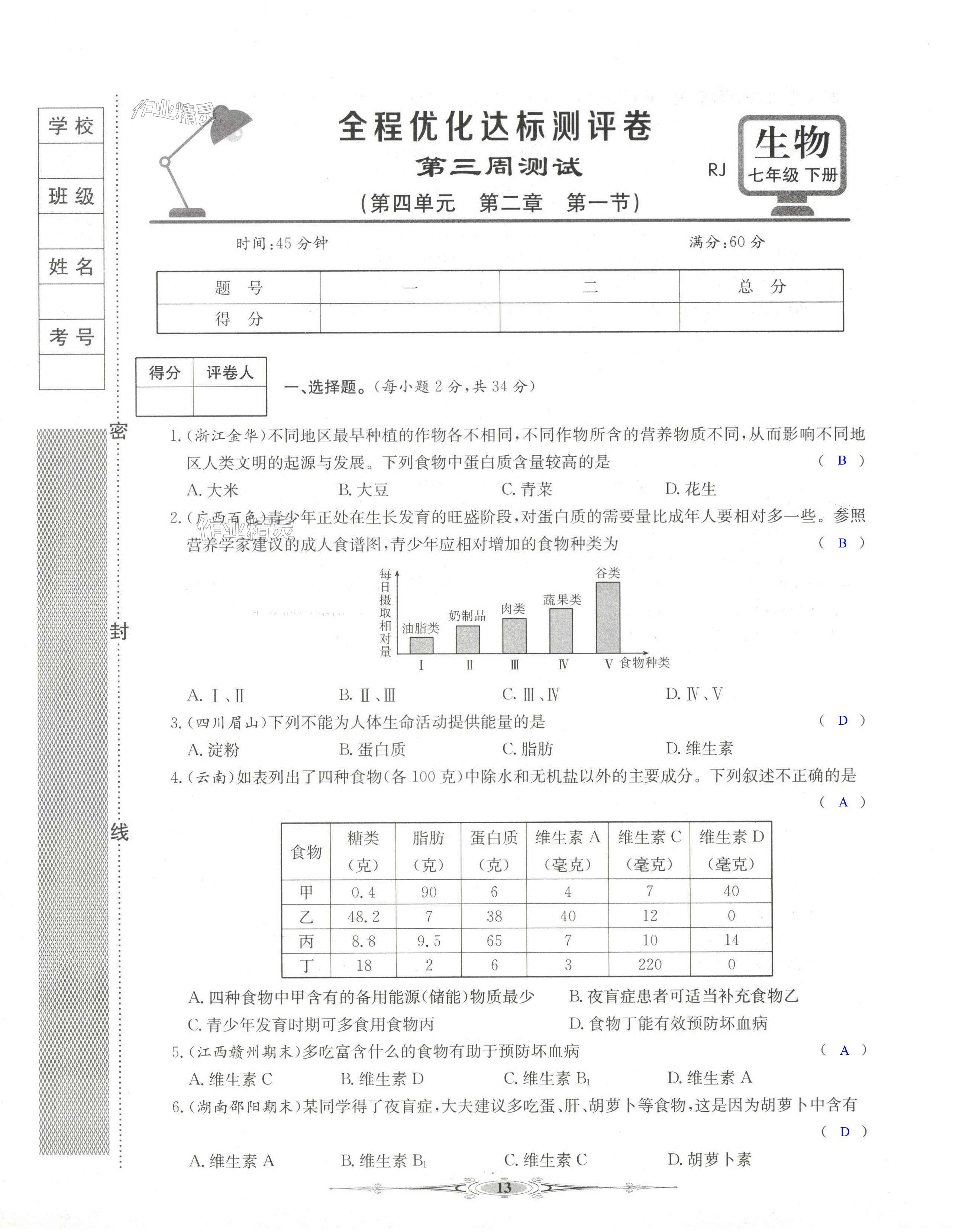 注:目前有些书本章节名称可能整理的还不是很完善,但都是按照顺序排列的,请同学们按照顺序仔细查找。练习册 2024年全能好卷七年级生物下册人教版 答案主要是用来给同学们做完题方便对答案用的,请勿直接抄袭。