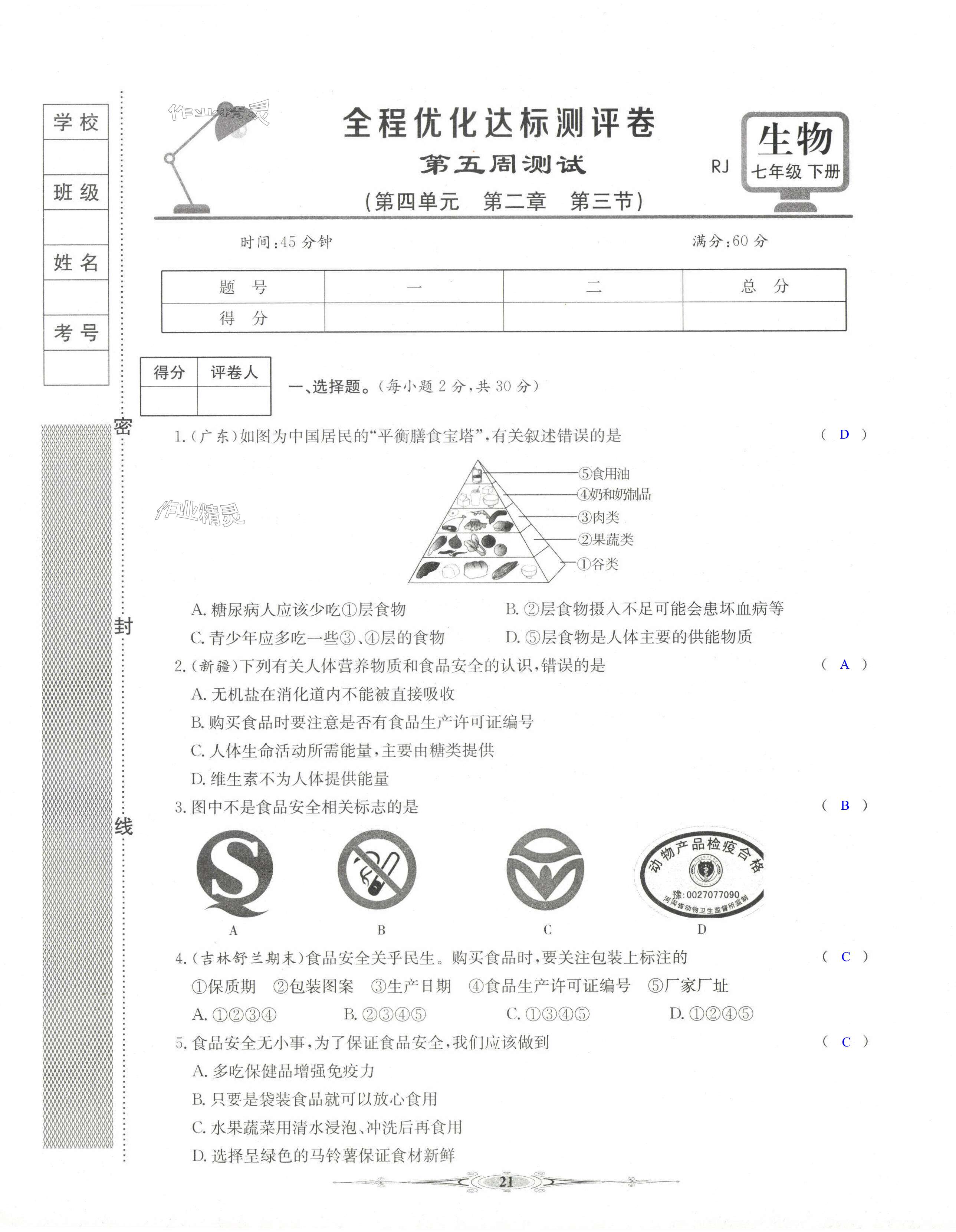 注:目前有些书本章节名称可能整理的还不是很完善,但都是按照顺序排列的,请同学们按照顺序仔细查找。练习册 2024年全能好卷七年级生物下册人教版 答案主要是用来给同学们做完题方便对答案用的,请勿直接抄袭。