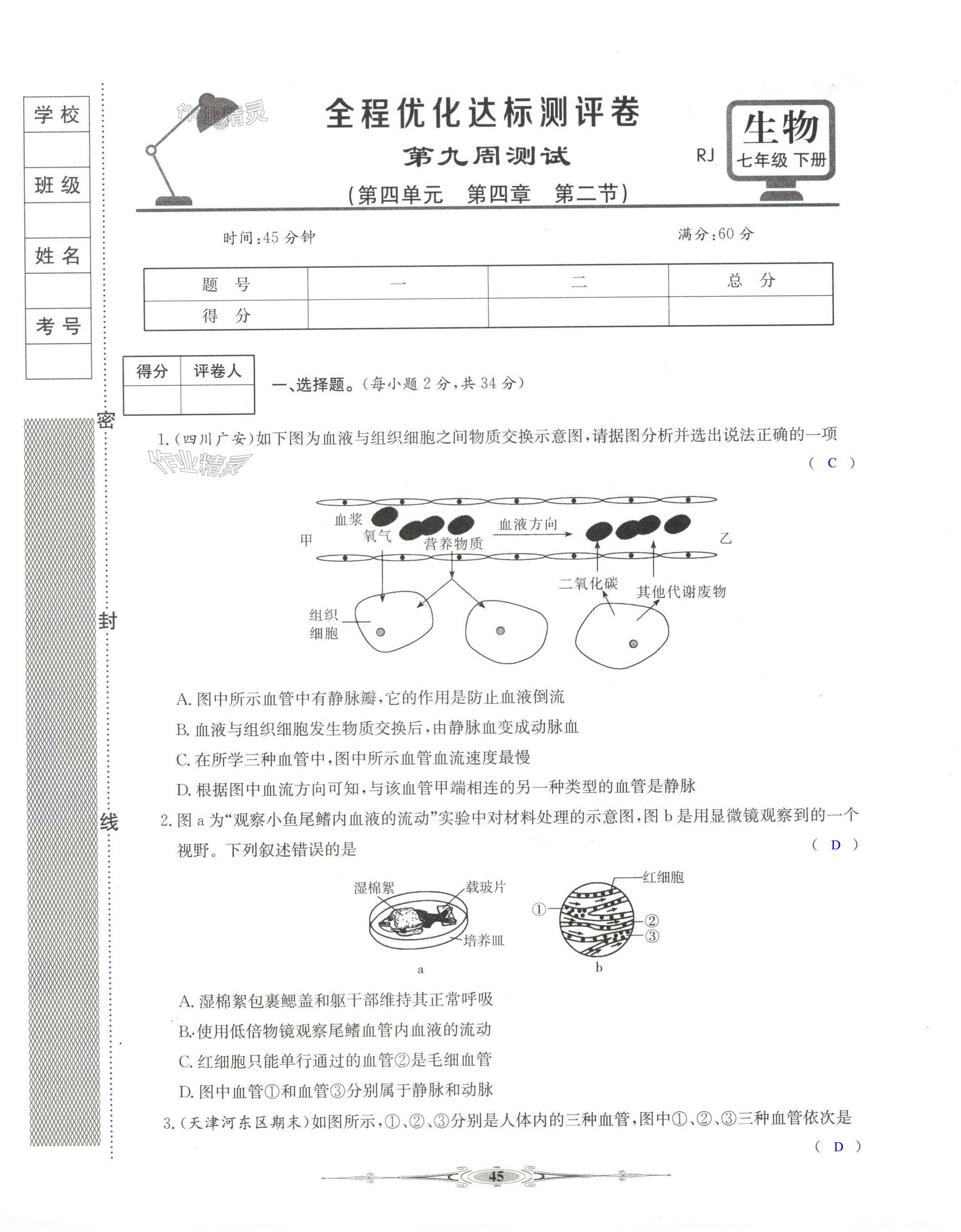 注:目前有些书本章节名称可能整理的还不是很完善,但都是按照顺序排列的,请同学们按照顺序仔细查找。练习册 2024年全能好卷七年级生物下册人教版 答案主要是用来给同学们做完题方便对答案用的,请勿直接抄袭。