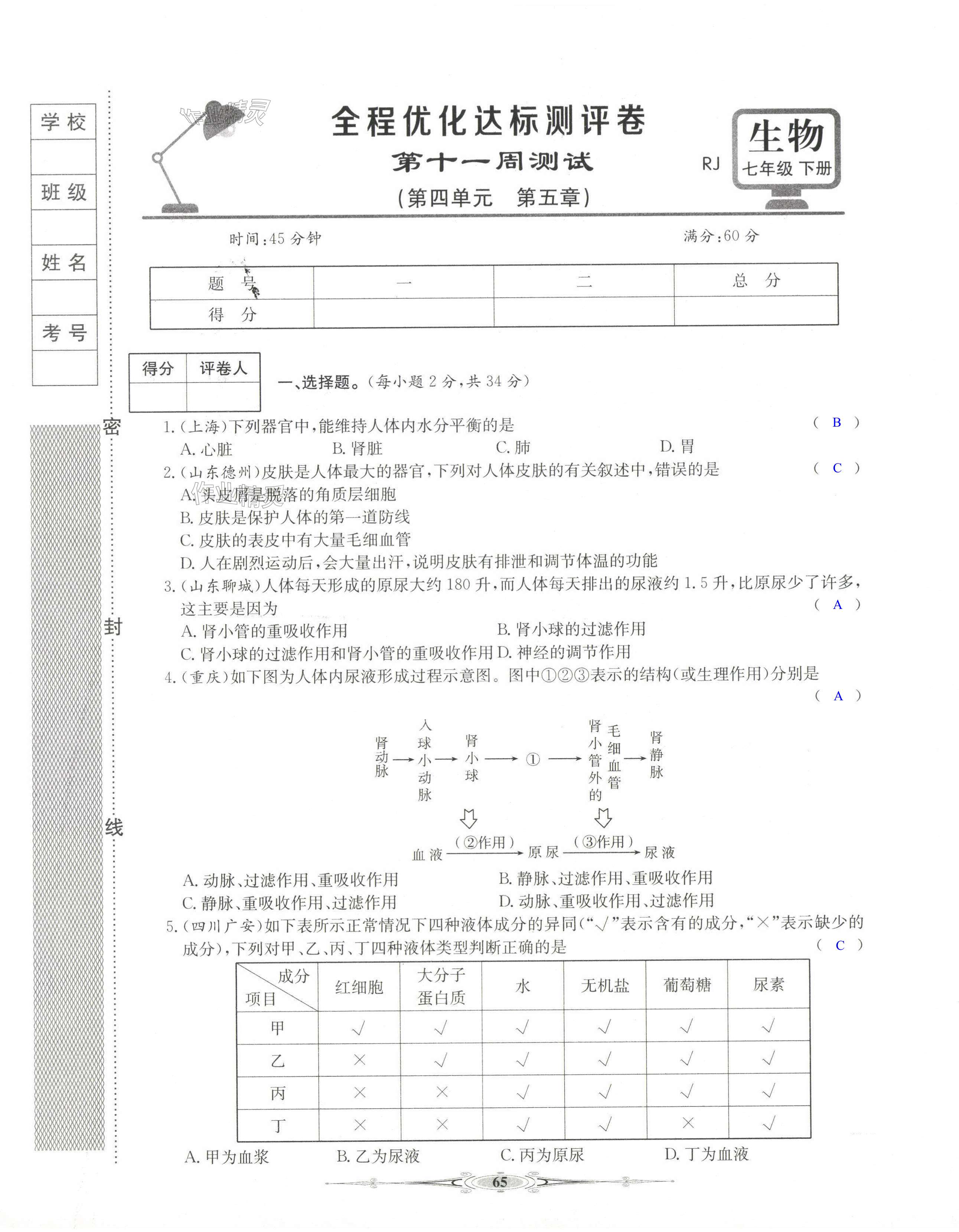 注:目前有些书本章节名称可能整理的还不是很完善,但都是按照顺序排列的,请同学们按照顺序仔细查找。练习册 2024年全能好卷七年级生物下册人教版 答案主要是用来给同学们做完题方便对答案用的,请勿直接抄袭。