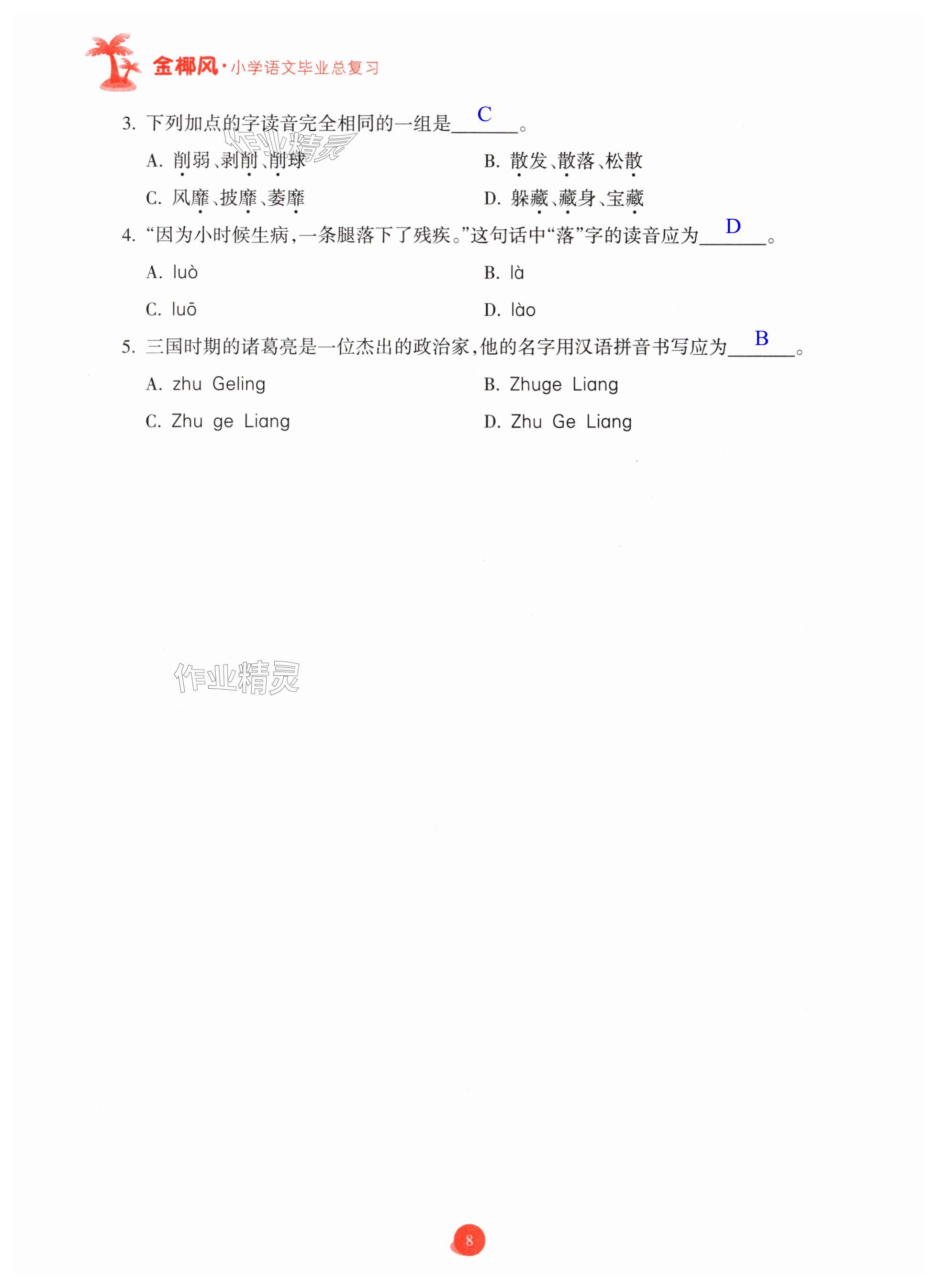 注:目前有些书本章节名称可能整理的还不是很完善,但都是按照顺序排列的,请同学们按照顺序仔细查找。练习册 2024年金椰风小学语文毕业总复习六年级人教版 答案主要是用来给同学们做完题方便对答案用的,请勿直接抄袭。