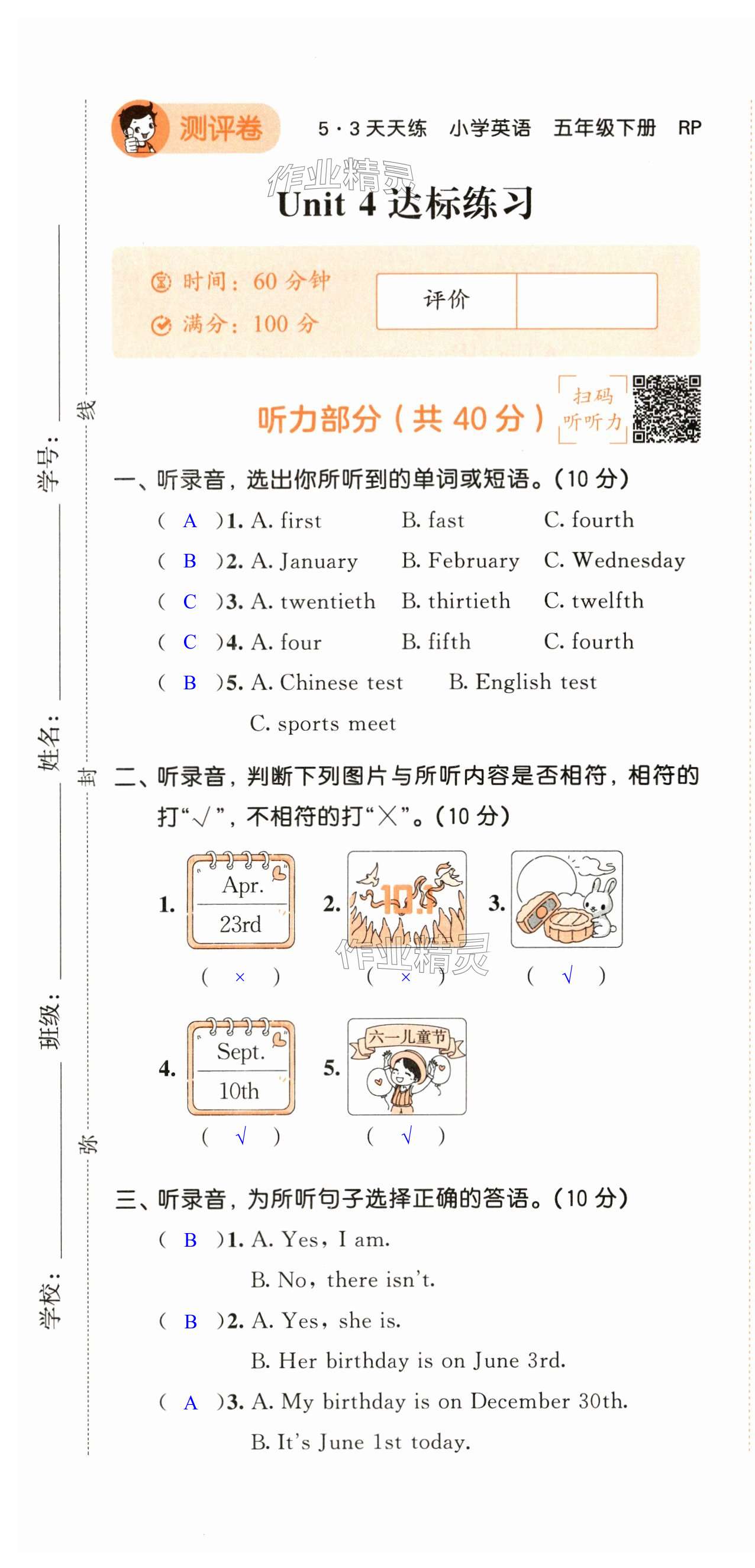 注:目前有些书本章节名称可能整理的还不是很完善,但都是按照顺序排列的,请同学们按照顺序仔细查找。练习册 2024年53天天练五年级英语下册人教版 答案主要是用来给同学们做完题方便对答案用的,请勿直接抄袭。