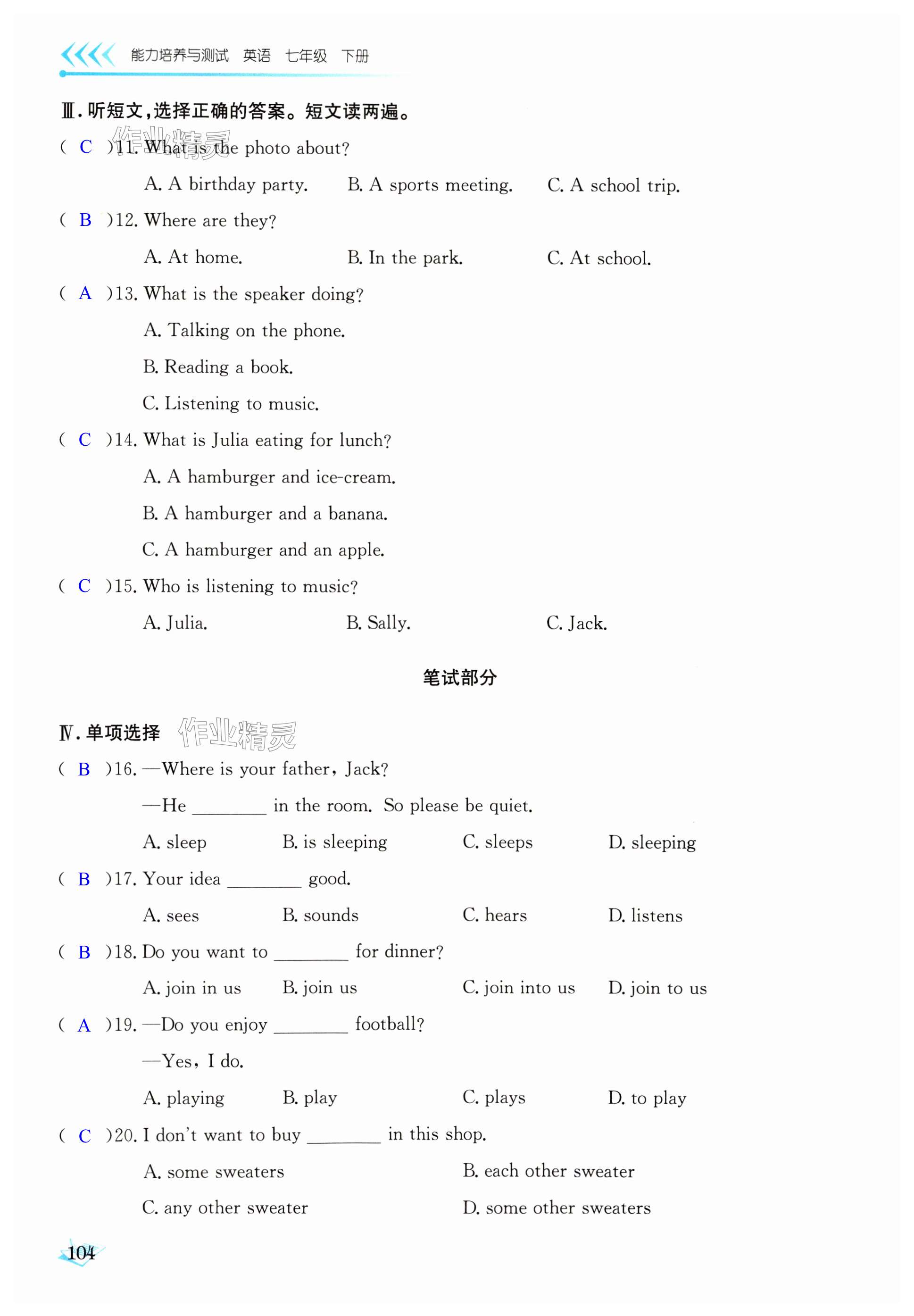 注:目前有些书本章节名称可能整理的还不是很完善,但都是按照顺序排列的,请同学们按照顺序仔细查找。练习册 2024年能力培养与测试七年级英语下册人教版 答案主要是用来给同学们做完题方便对答案用的,请勿直接抄袭。