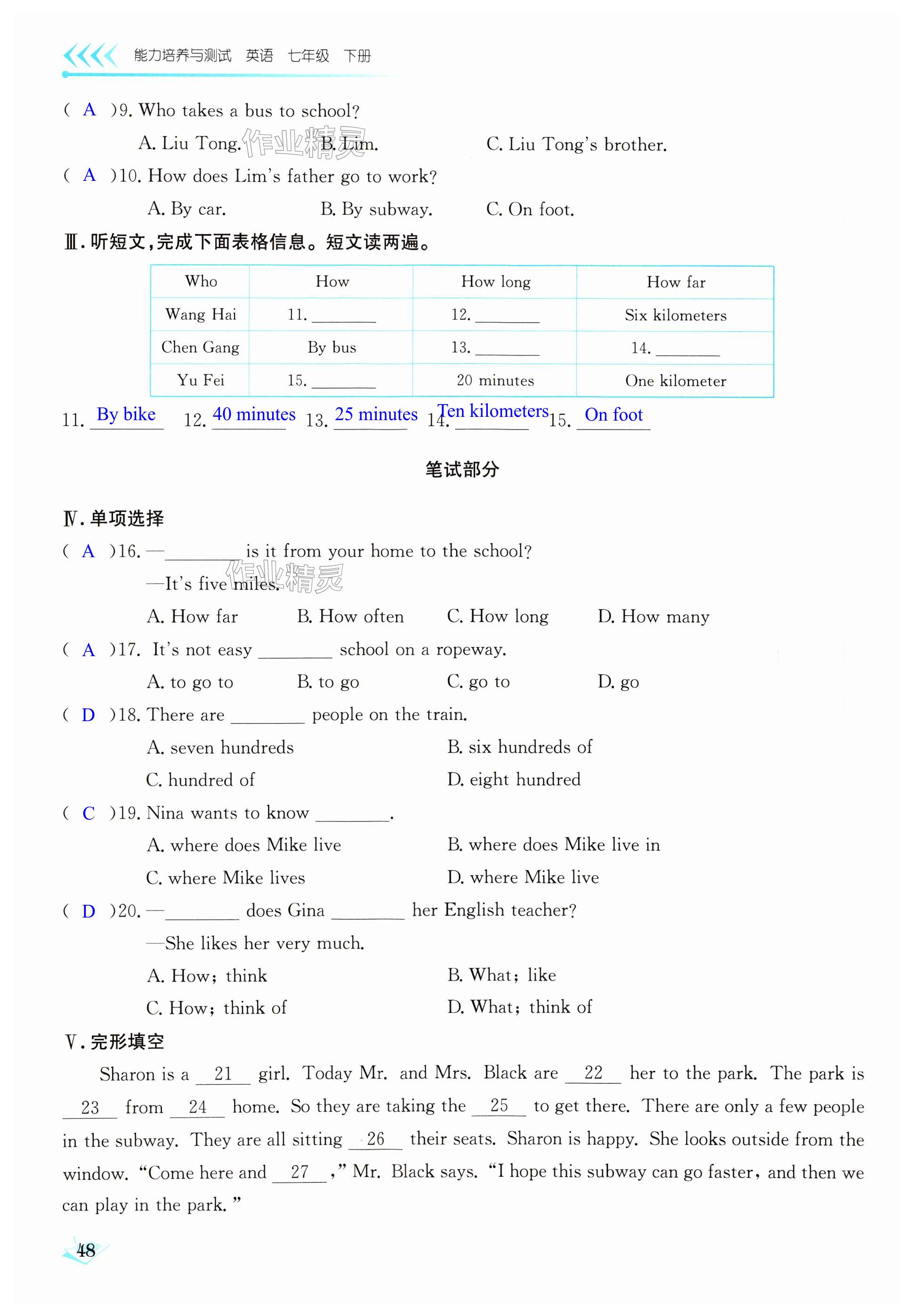 注:目前有些书本章节名称可能整理的还不是很完善,但都是按照顺序排列的,请同学们按照顺序仔细查找。练习册 2024年能力培养与测试七年级英语下册人教版 答案主要是用来给同学们做完题方便对答案用的,请勿直接抄袭。