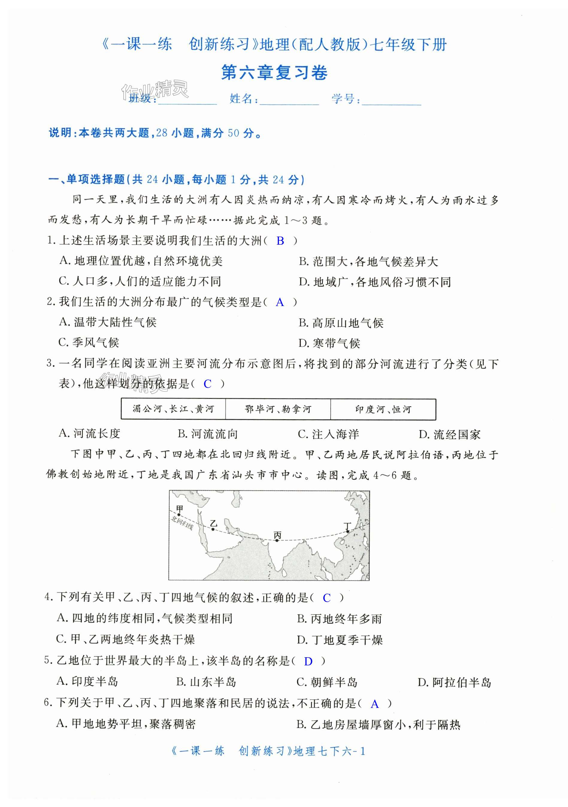 注:目前有些书本章节名称可能整理的还不是很完善,但都是按照顺序排列的,请同学们按照顺序仔细查找。练习册 2024年一课一练创新练习七年级地理下册人教版 答案主要是用来给同学们做完题方便对答案用的,请勿直接抄袭。