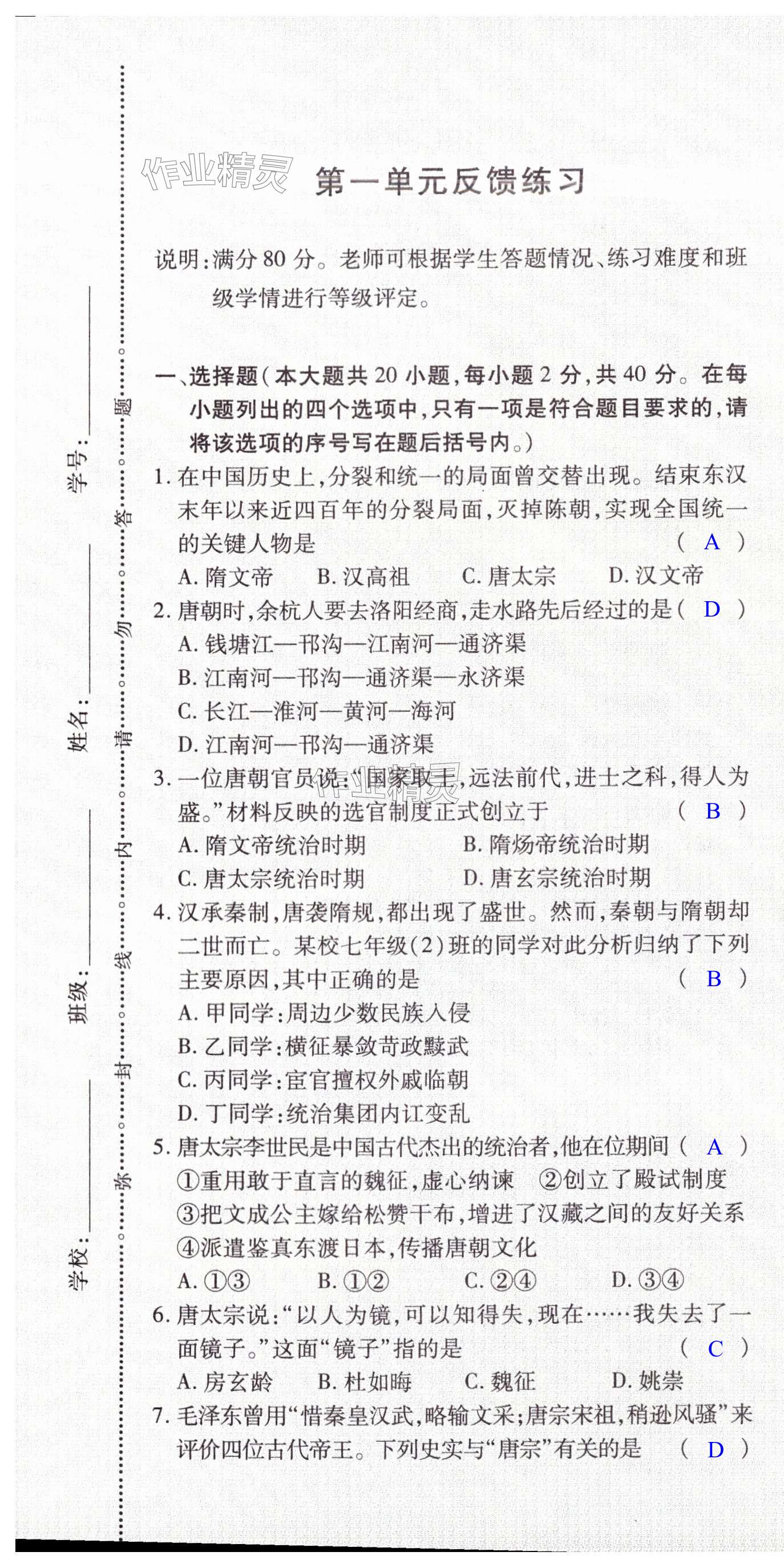 注:目前有些书本章节名称可能整理的还不是很完善,但都是按照顺序排列的,请同学们按照顺序仔细查找。练习册 2024年一课一练创新练习七年级历史下册人教版 答案主要是用来给同学们做完题方便对答案用的,请勿直接抄袭。