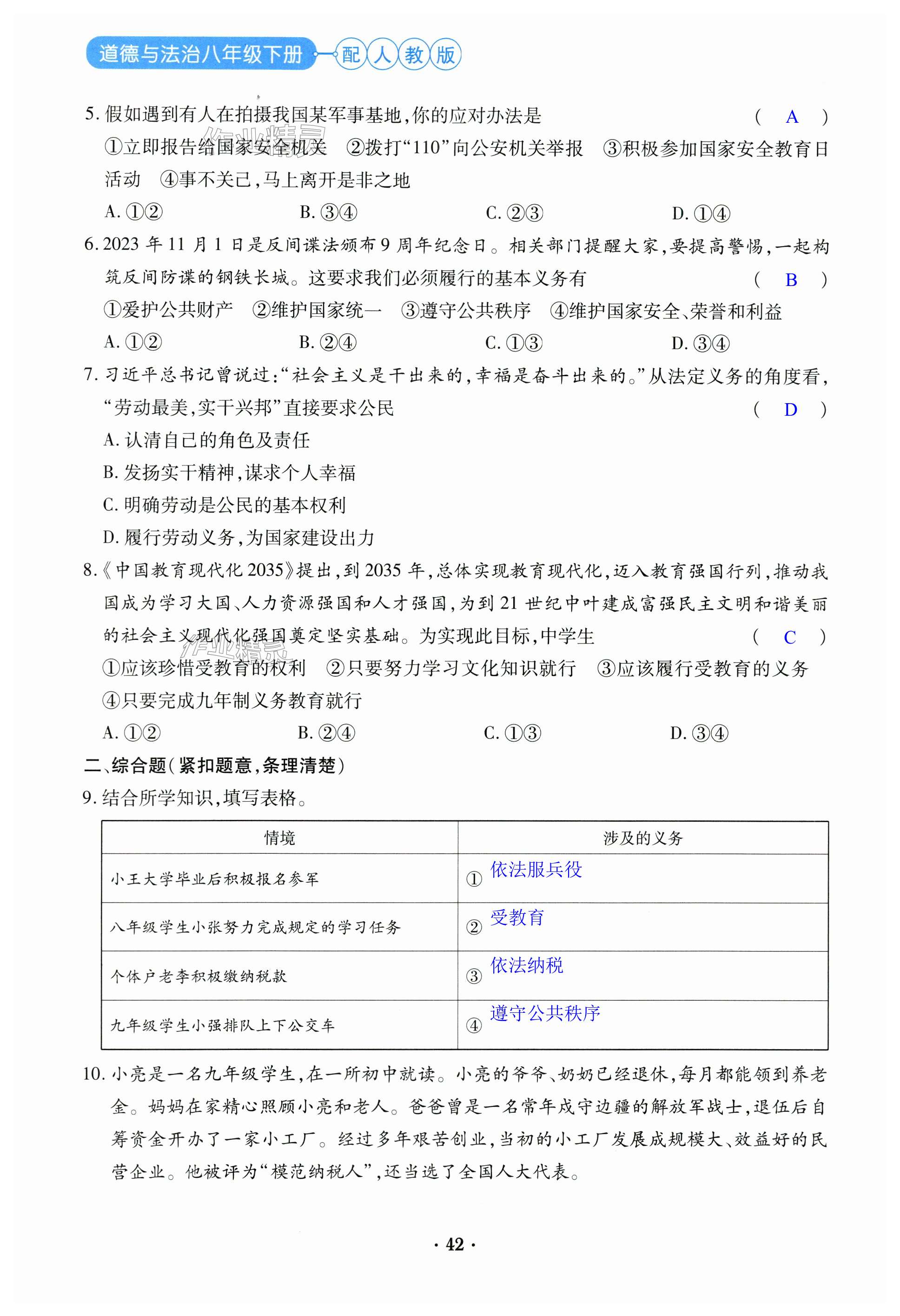 注:目前有些书本章节名称可能整理的还不是很完善,但都是按照顺序排列的,请同学们按照顺序仔细查找。练习册 2024年一课一练创新练习八年级道德与法治下册人教版 答案主要是用来给同学们做完题方便对答案用的,请勿直接抄袭。
