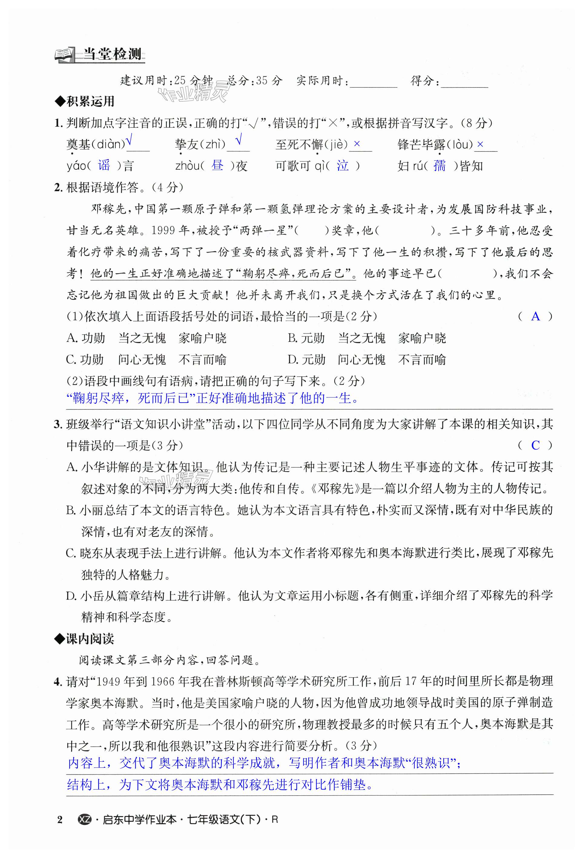 注:目前有些书本章节名称可能整理的还不是很完善,但都是按照顺序排列的,请同学们按照顺序仔细查找。练习册 2024年启东中学作业本七年级语文下册人教版徐州专版 答案主要是用来给同学们做完题方便对答案用的,请勿直接抄袭。