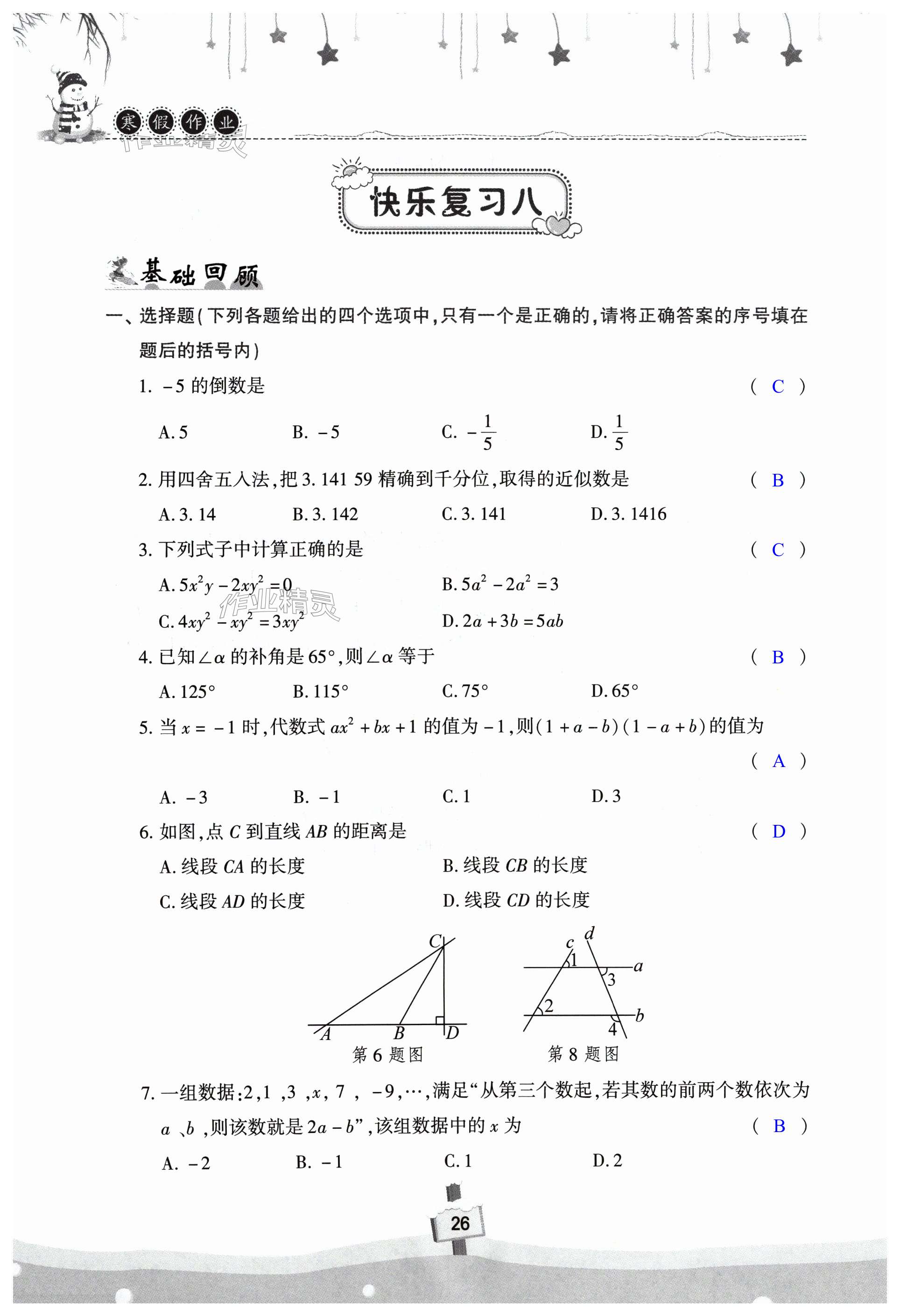 注:目前有些书本章节名称可能整理的还不是很完善,但都是按照顺序排列的,请同学们按照顺序仔细查找。练习册 2024年快乐寒假天天练七年级数学华师大版 答案主要是用来给同学们做完题方便对答案用的,请勿直接抄袭。