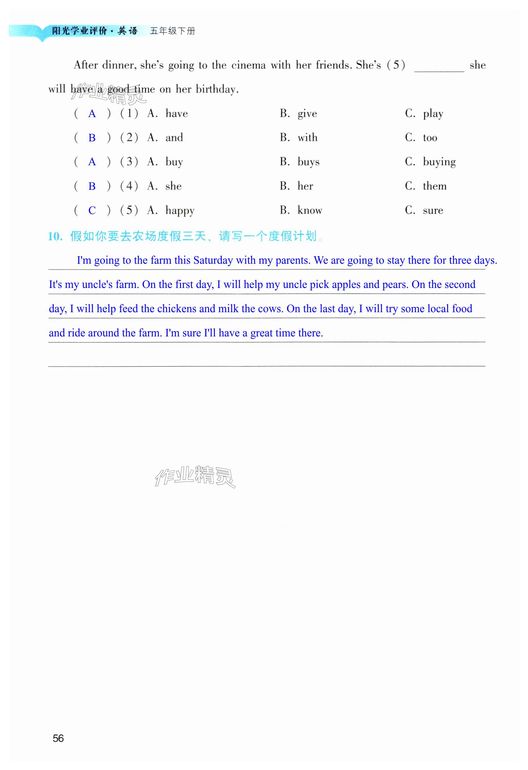 注:目前有些书本章节名称可能整理的还不是很完善,但都是按照顺序排列的,请同学们按照顺序仔细查找。练习册 2024年阳光学业评价五年级英语下册教科版 答案主要是用来给同学们做完题方便对答案用的,请勿直接抄袭。