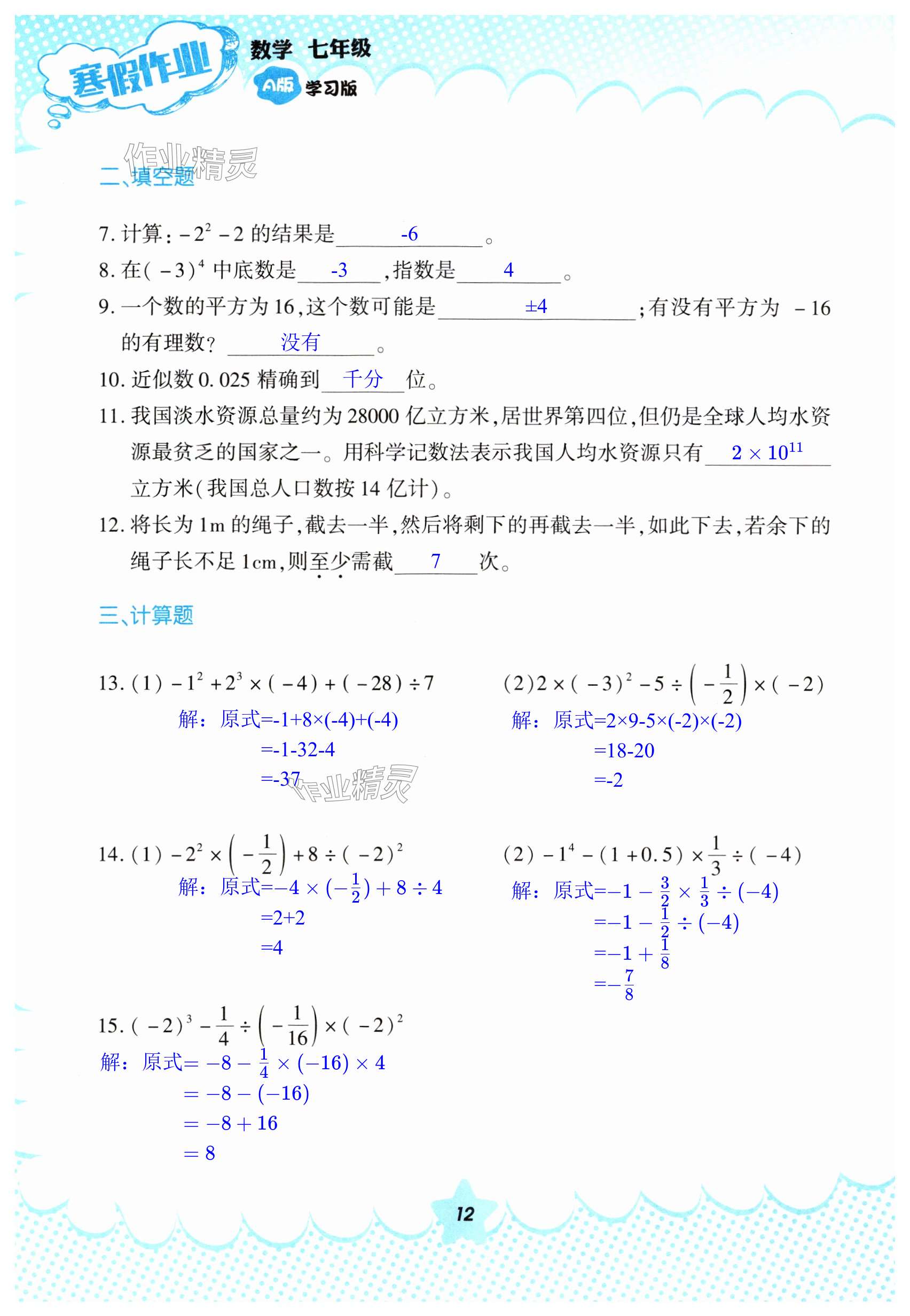 2024年寒假作业教育科学出版社七年级数学人教版
