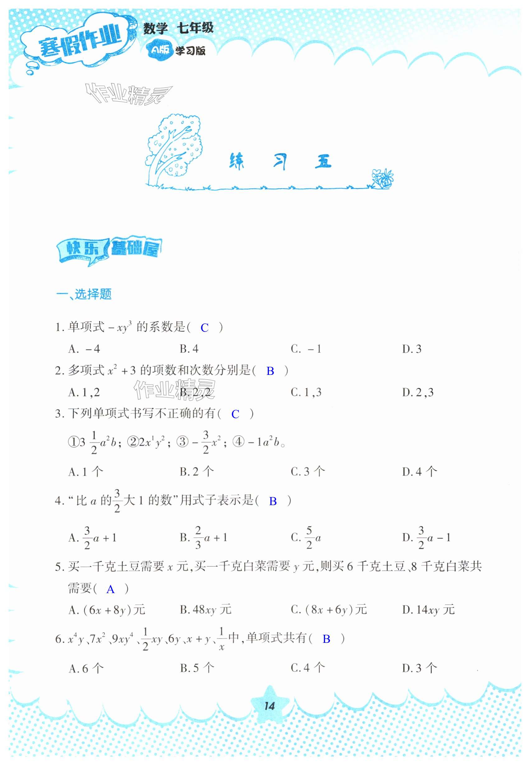 注:目前有些书本章节名称可能整理的还不是很完善,但都是按照顺序排列的,请同学们按照顺序仔细查找。练习册 2024年寒假作业教育科学出版社七年级数学人教版 答案主要是用来给同学们做完题方便对答案用的,请勿直接抄袭。
