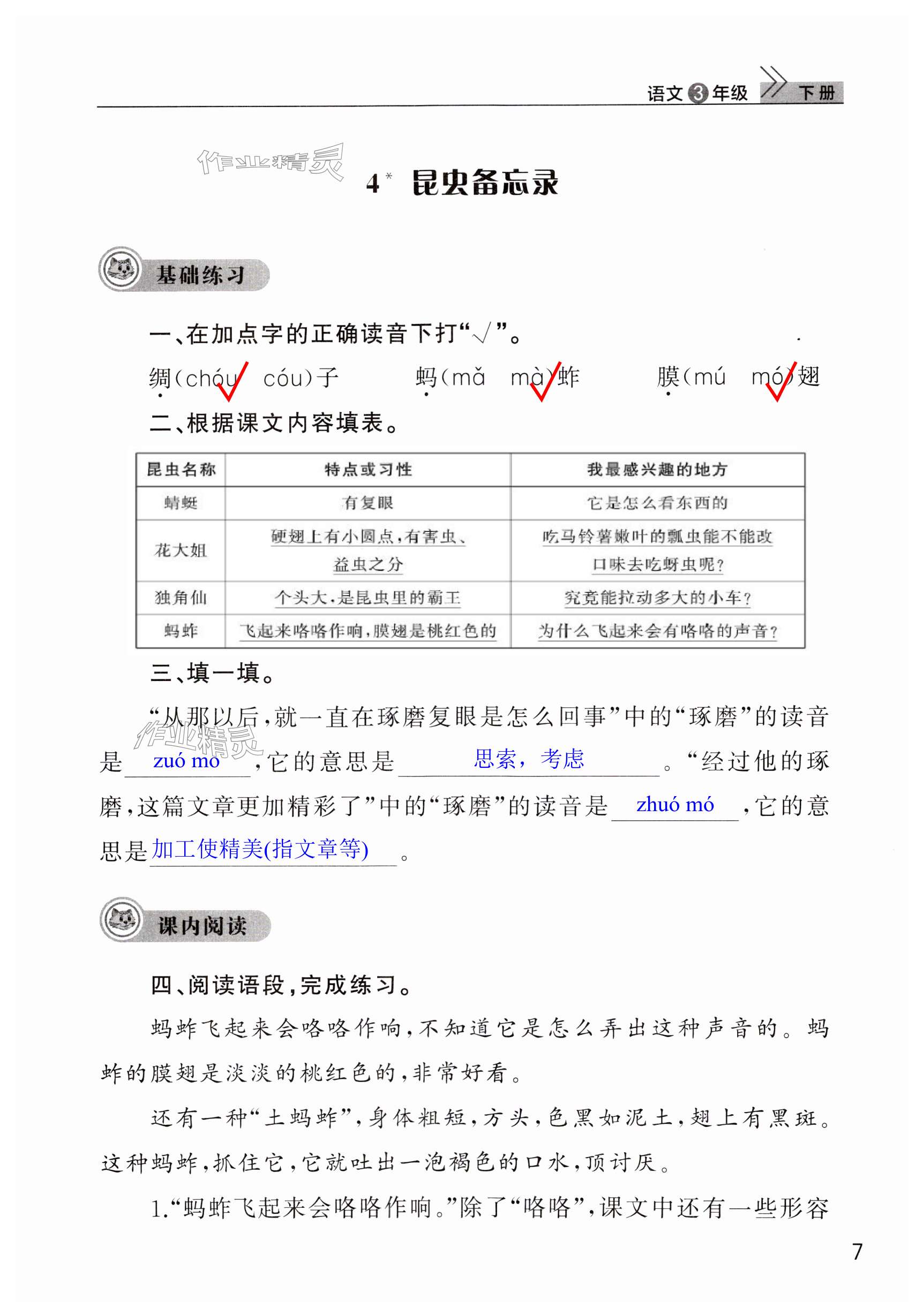 注:目前有些书本章节名称可能整理的还不是很完善,但都是按照顺序排列的,请同学们按照顺序仔细查找。练习册 2024年课堂作业三年级语文下册人教版武汉出版社 答案主要是用来给同学们做完题方便对答案用的,请勿直接抄袭。