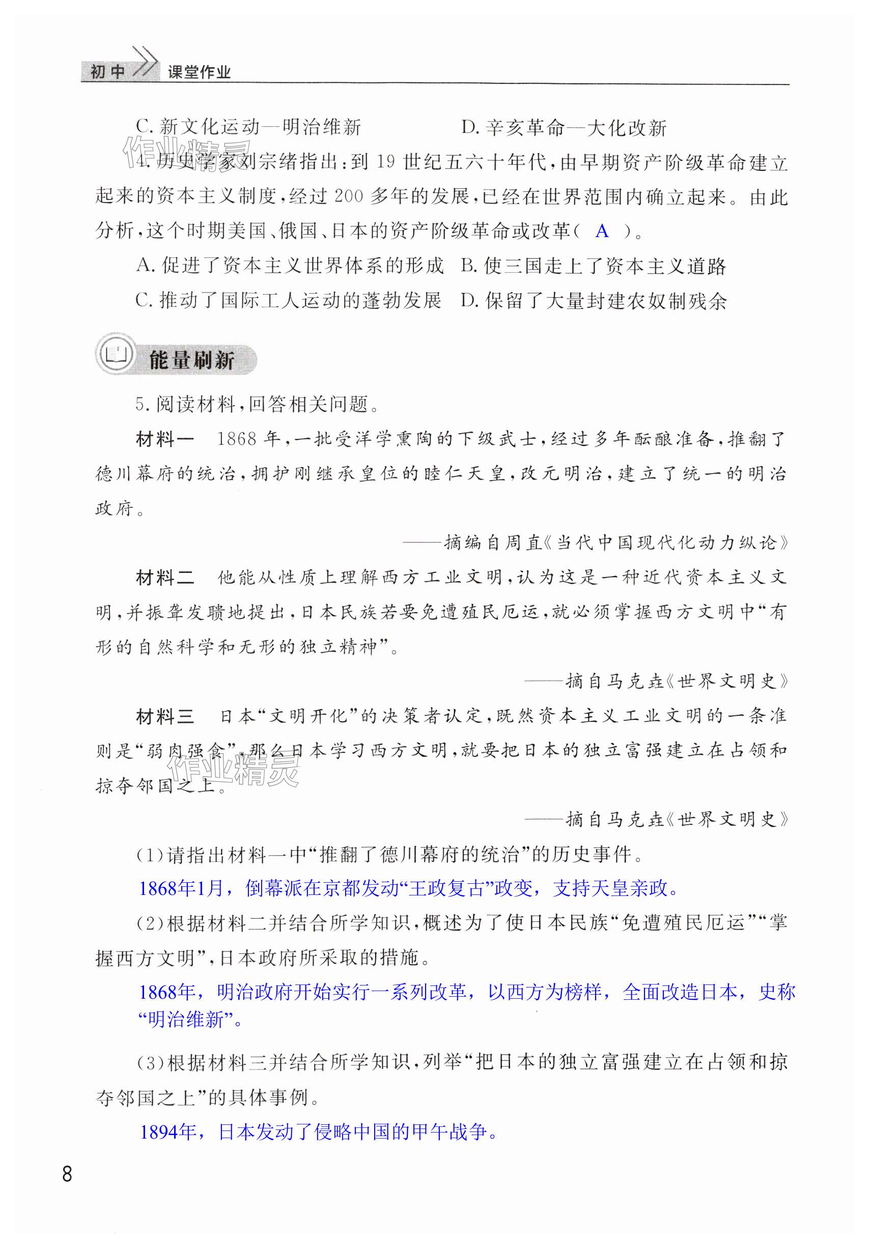 注:目前有些书本章节名称可能整理的还不是很完善,但都是按照顺序排列的,请同学们按照顺序仔细查找。练习册 2024年课堂作业武汉出版社九年级历史下册人教版 答案主要是用来给同学们做完题方便对答案用的,请勿直接抄袭。