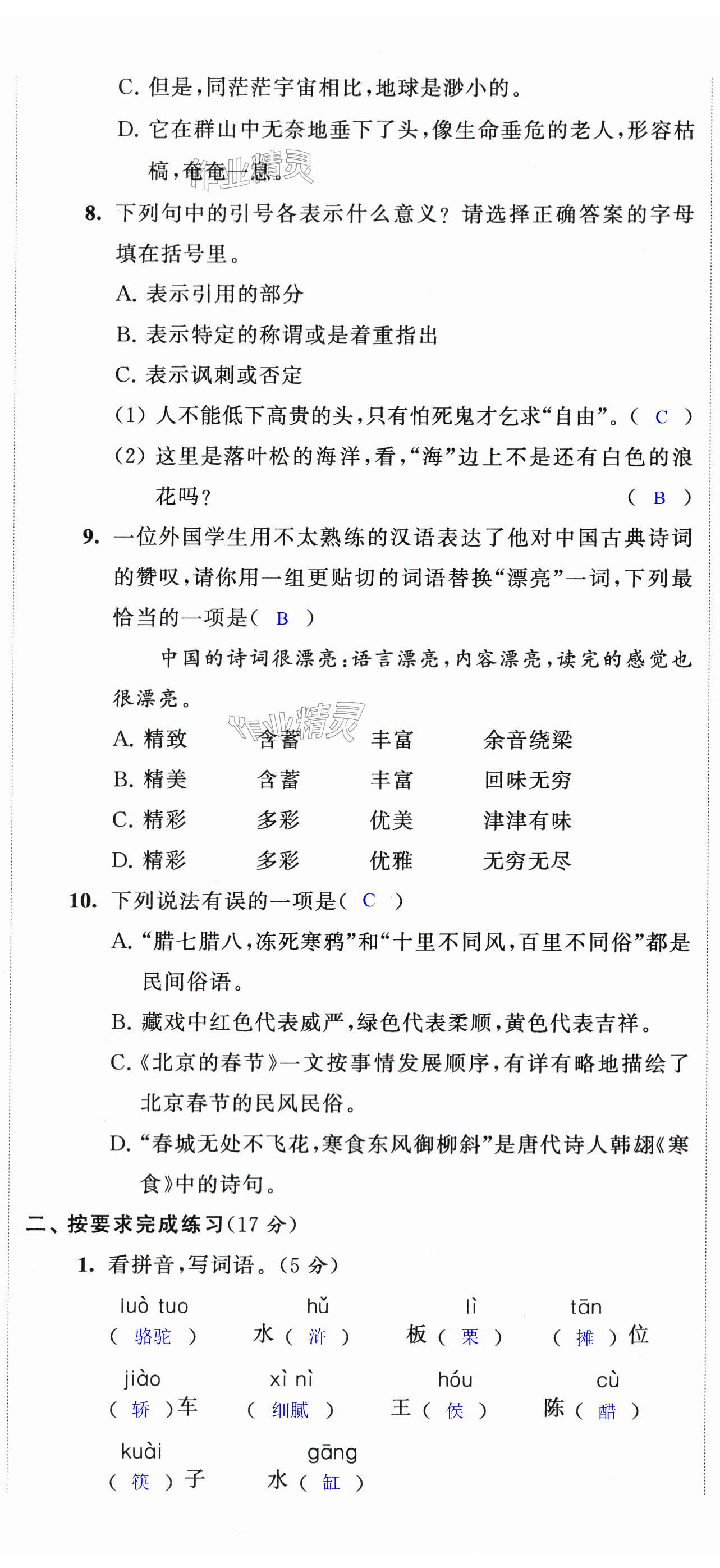 注:目前有些书本章节名称可能整理的还不是很完善,但都是按照顺序排列的,请同学们按照顺序仔细查找。练习册 2024年阳光互动绿色成长空间六年级语文下册提优版 答案主要是用来给同学们做完题方便对答案用的,请勿直接抄袭。