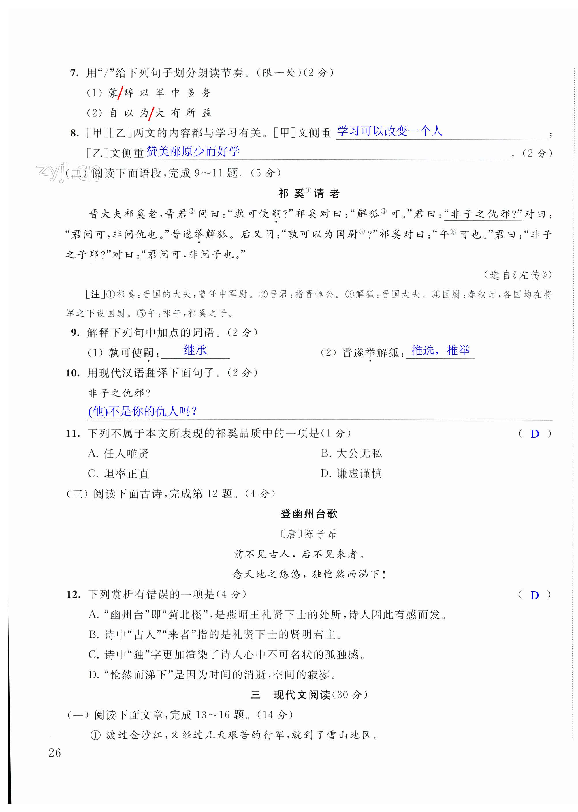 注:目前有些书本章节名称可能整理的还不是很完善,但都是按照顺序排列的,请同学们按照顺序仔细查找。练习册 2024年阳光互动绿色成长空间七年级语文下册提优版 答案主要是用来给同学们做完题方便对答案用的,请勿直接抄袭。