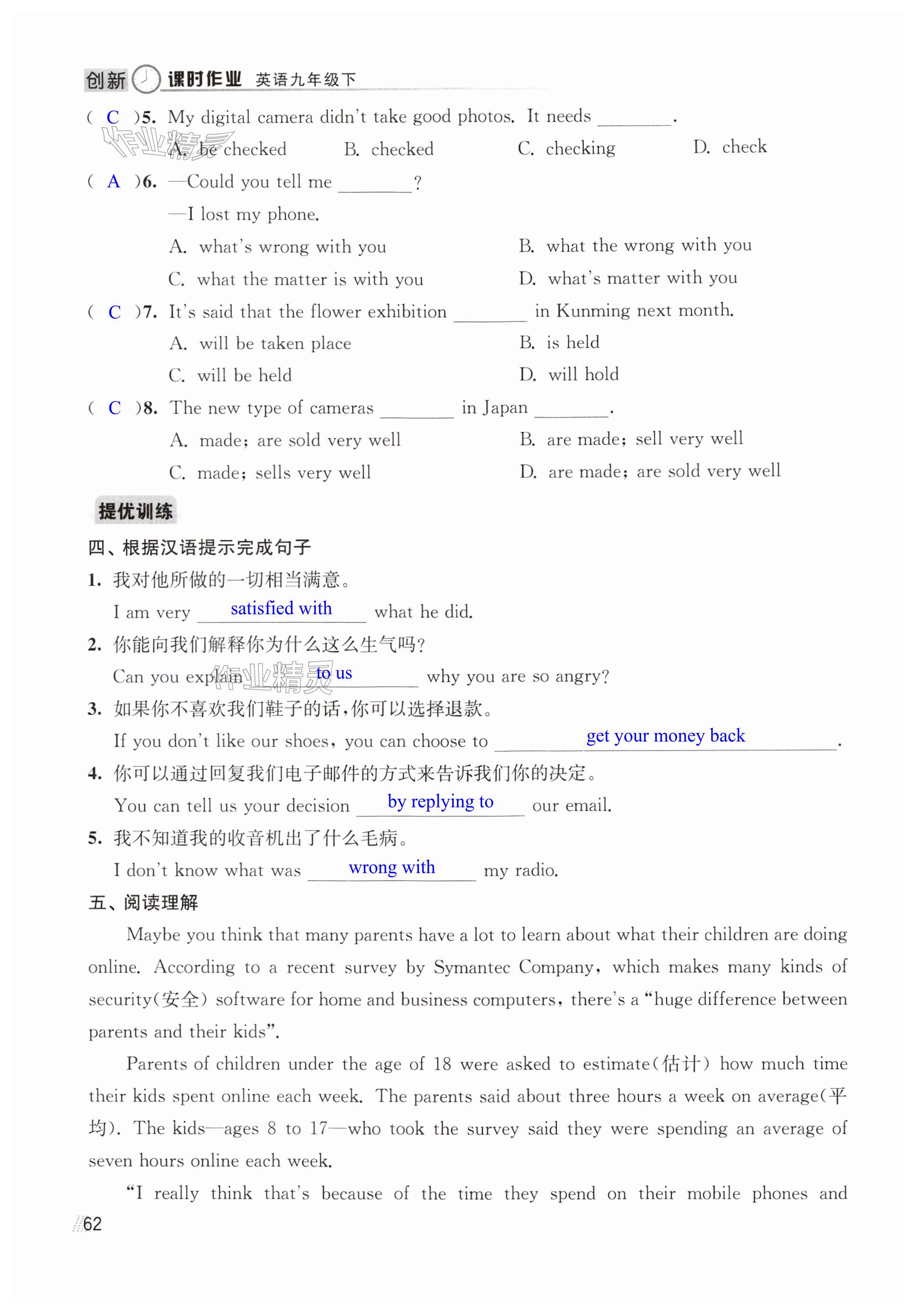 注:目前有些书本章节名称可能整理的还不是很完善,但都是按照顺序排列的,请同学们按照顺序仔细查找。练习册 2024年创新课时作业九年级英语下册译林版 答案主要是用来给同学们做完题方便对答案用的,请勿直接抄袭。
