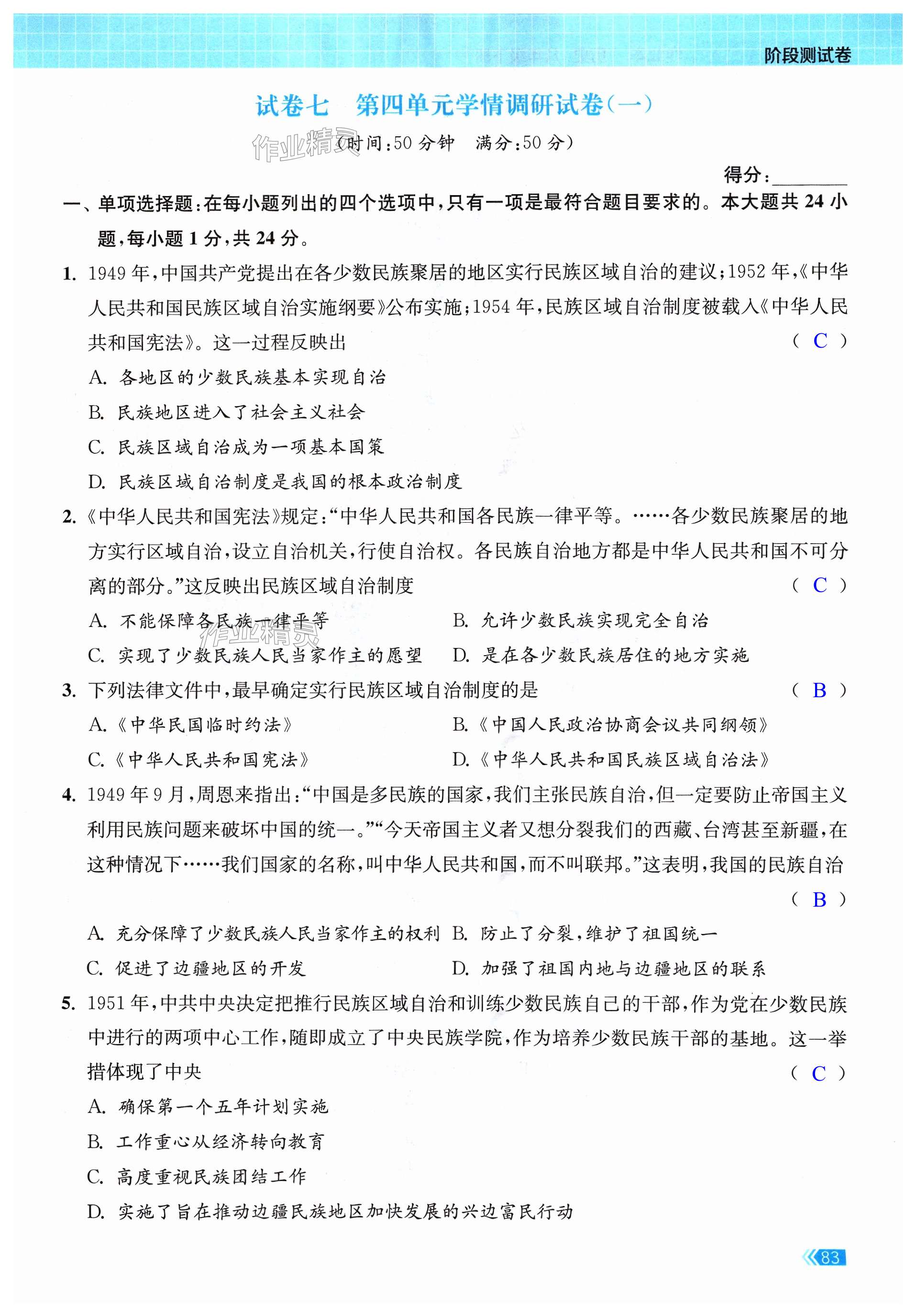 注:目前有些书本章节名称可能整理的还不是很完善,但都是按照顺序排列的,请同学们按照顺序仔细查找。练习册 2024年课时提优计划作业本八年级历史下册人教版 答案主要是用来给同学们做完题方便对答案用的,请勿直接抄袭。