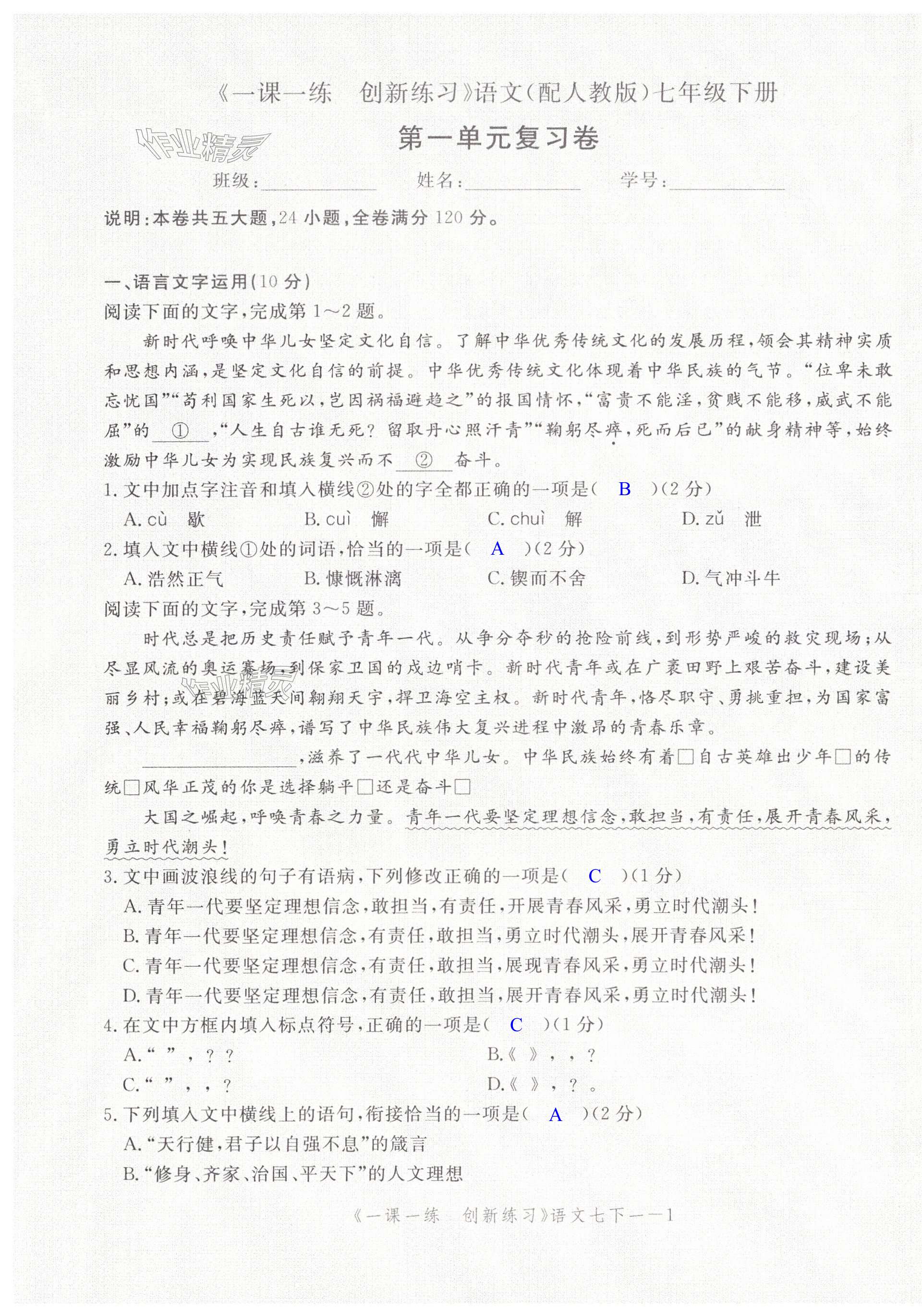 注:目前有些书本章节名称可能整理的还不是很完善,但都是按照顺序排列的,请同学们按照顺序仔细查找。练习册 2024年一课一练创新练习七年级语文下册人教版 答案主要是用来给同学们做完题方便对答案用的,请勿直接抄袭。