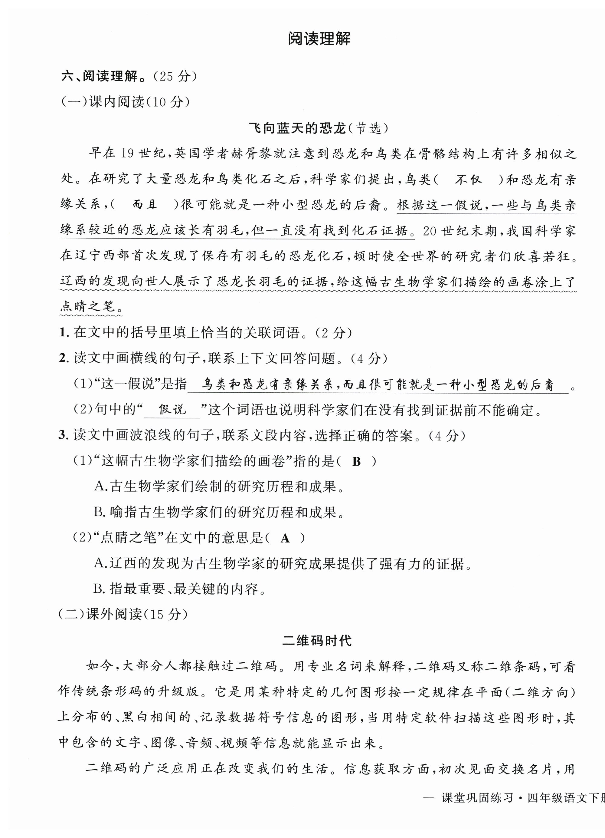 注:目前有些书本章节名称可能整理的还不是很完善,但都是按照顺序排列的,请同学们按照顺序仔细查找。练习册 2024年课堂巩固练习四年级语文下册人教版 答案主要是用来给同学们做完题方便对答案用的,请勿直接抄袭。