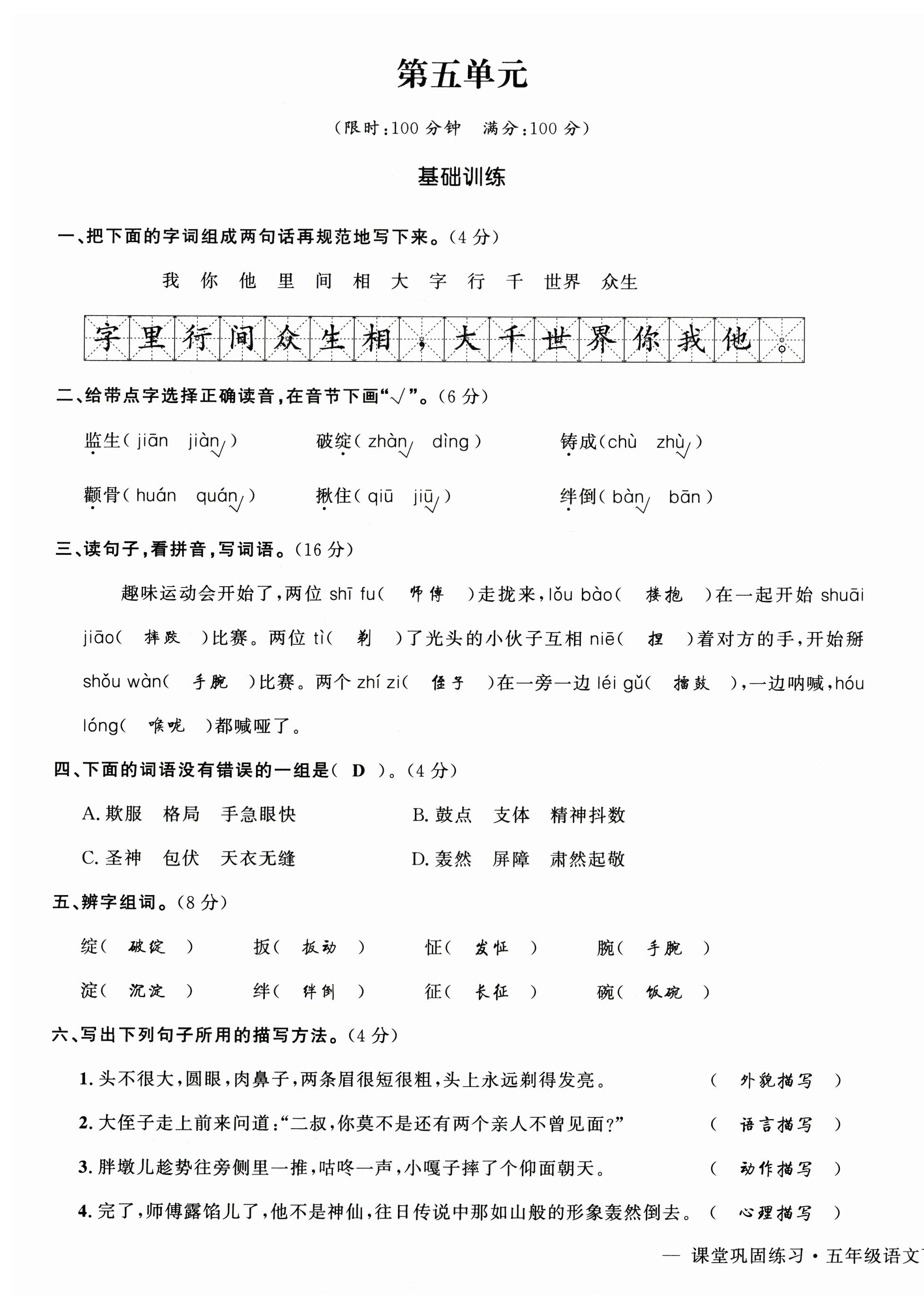 注:目前有些书本章节名称可能整理的还不是很完善,但都是按照顺序排列的,请同学们按照顺序仔细查找。练习册 2024年课堂巩固练习五年级语文下册人教版 答案主要是用来给同学们做完题方便对答案用的,请勿直接抄袭。