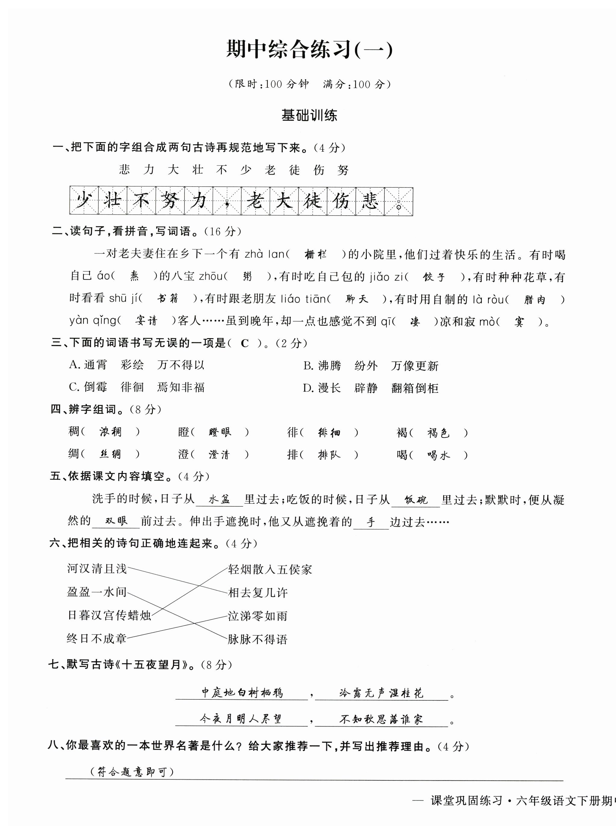 注:目前有些书本章节名称可能整理的还不是很完善,但都是按照顺序排列的,请同学们按照顺序仔细查找。练习册 2024年课堂巩固练习六年级语文下册人教版 答案主要是用来给同学们做完题方便对答案用的,请勿直接抄袭。