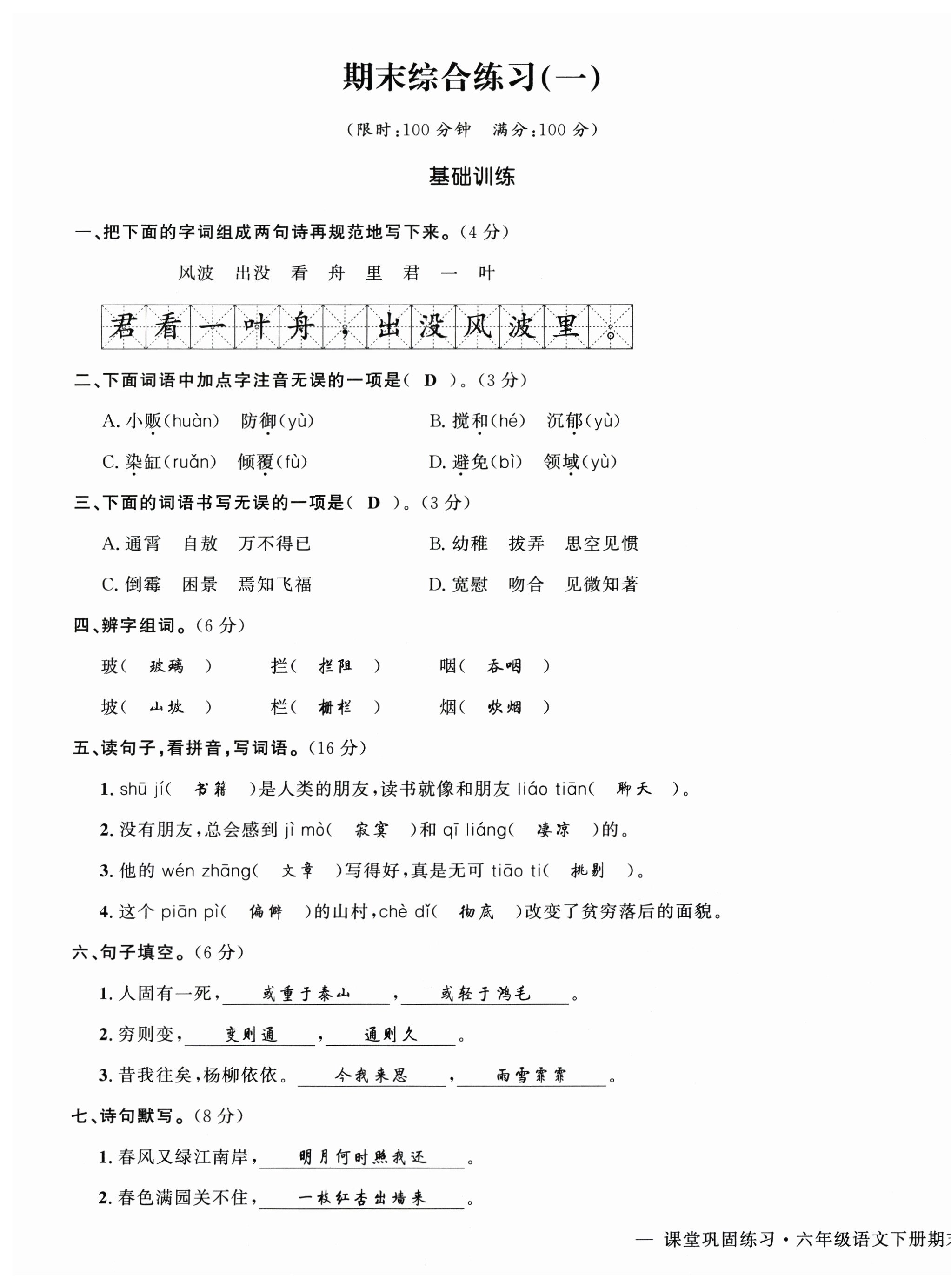 注:目前有些书本章节名称可能整理的还不是很完善,但都是按照顺序排列的,请同学们按照顺序仔细查找。练习册 2024年课堂巩固练习六年级语文下册人教版 答案主要是用来给同学们做完题方便对答案用的,请勿直接抄袭。