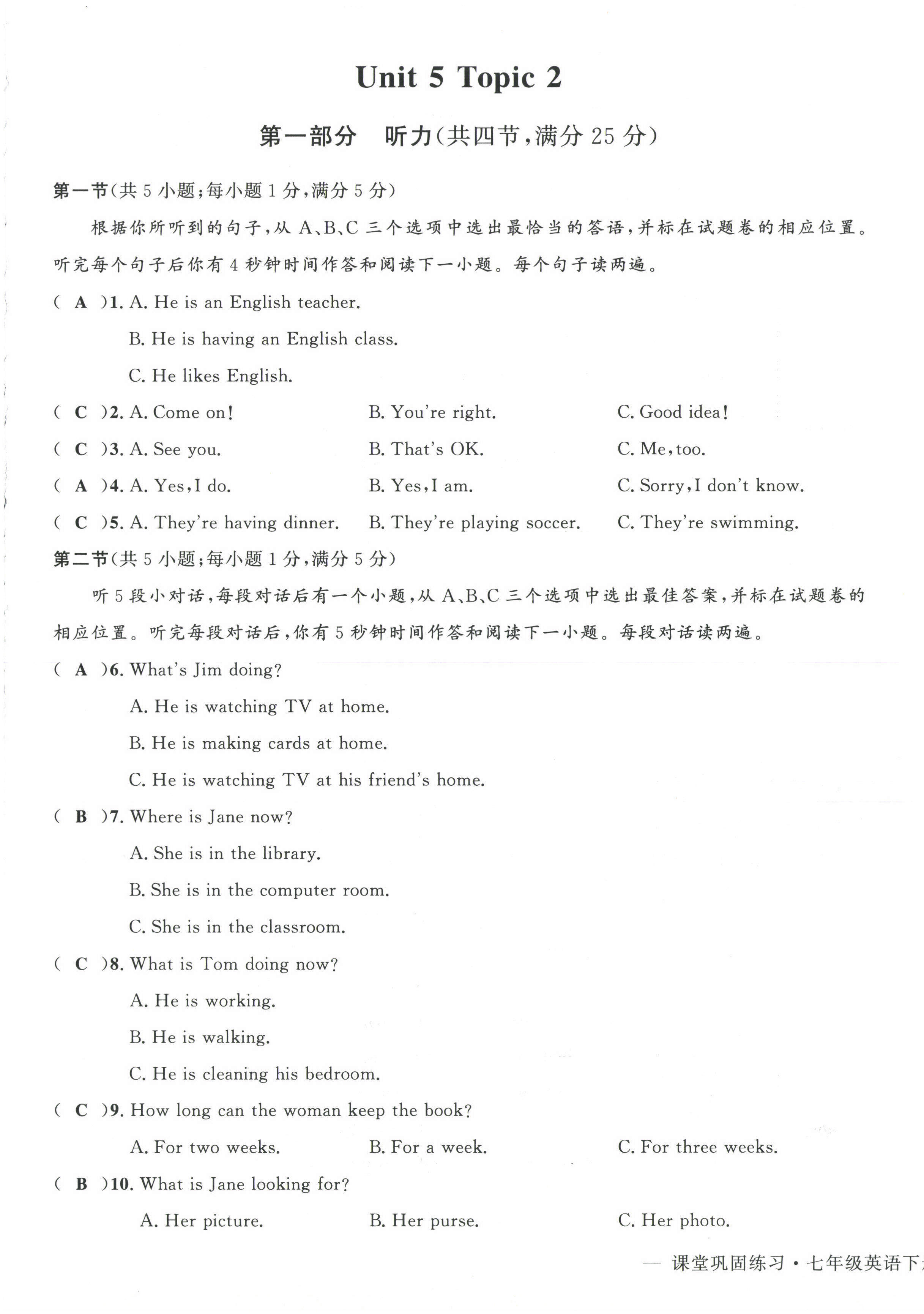 注:目前有些书本章节名称可能整理的还不是很完善,但都是按照顺序排列的,请同学们按照顺序仔细查找。练习册 2024年课堂巩固练习七年级英语下册仁爱版 答案主要是用来给同学们做完题方便对答案用的,请勿直接抄袭。