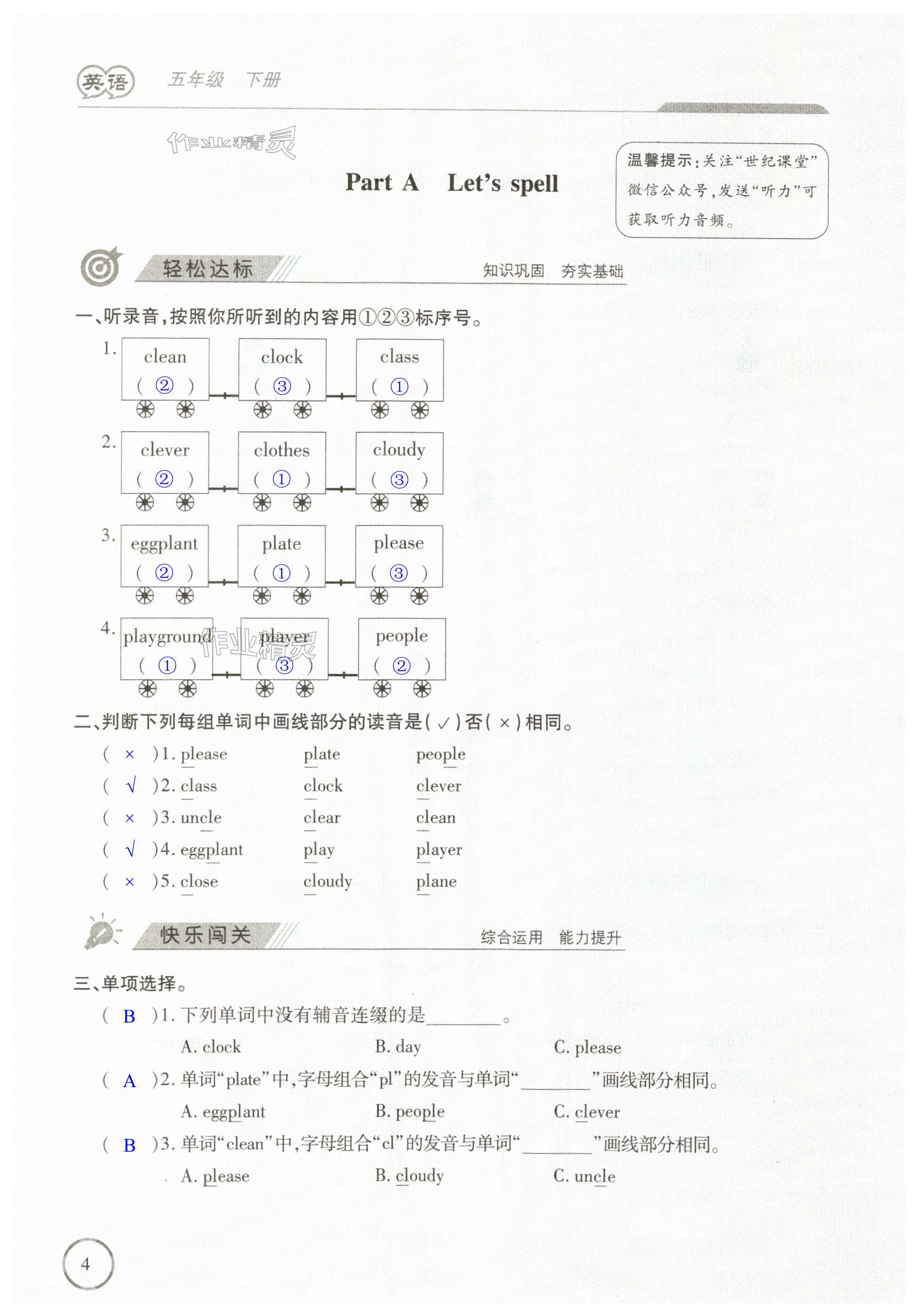 注:目前有些书本章节名称可能整理的还不是很完善,但都是按照顺序排列的,请同学们按照顺序仔细查找。练习册 2024年新课程新练习五年级英语下册人教版 答案主要是用来给同学们做完题方便对答案用的,请勿直接抄袭。