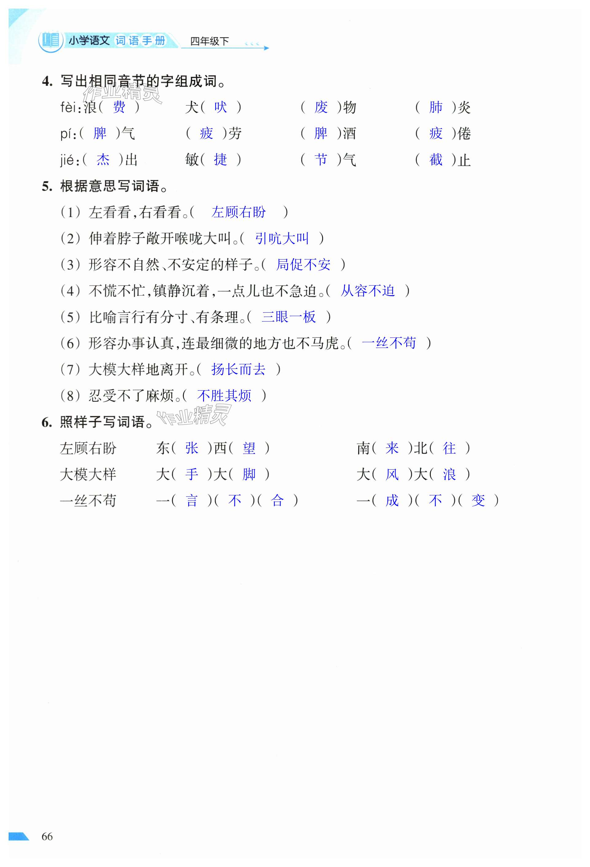 注:目前有些书本章节名称可能整理的还不是很完善,但都是按照顺序排列的,请同学们按照顺序仔细查找。练习册 2024年小学语文词语手册四年级下册人教版开明出版社 答案主要是用来给同学们做完题方便对答案用的,请勿直接抄袭。