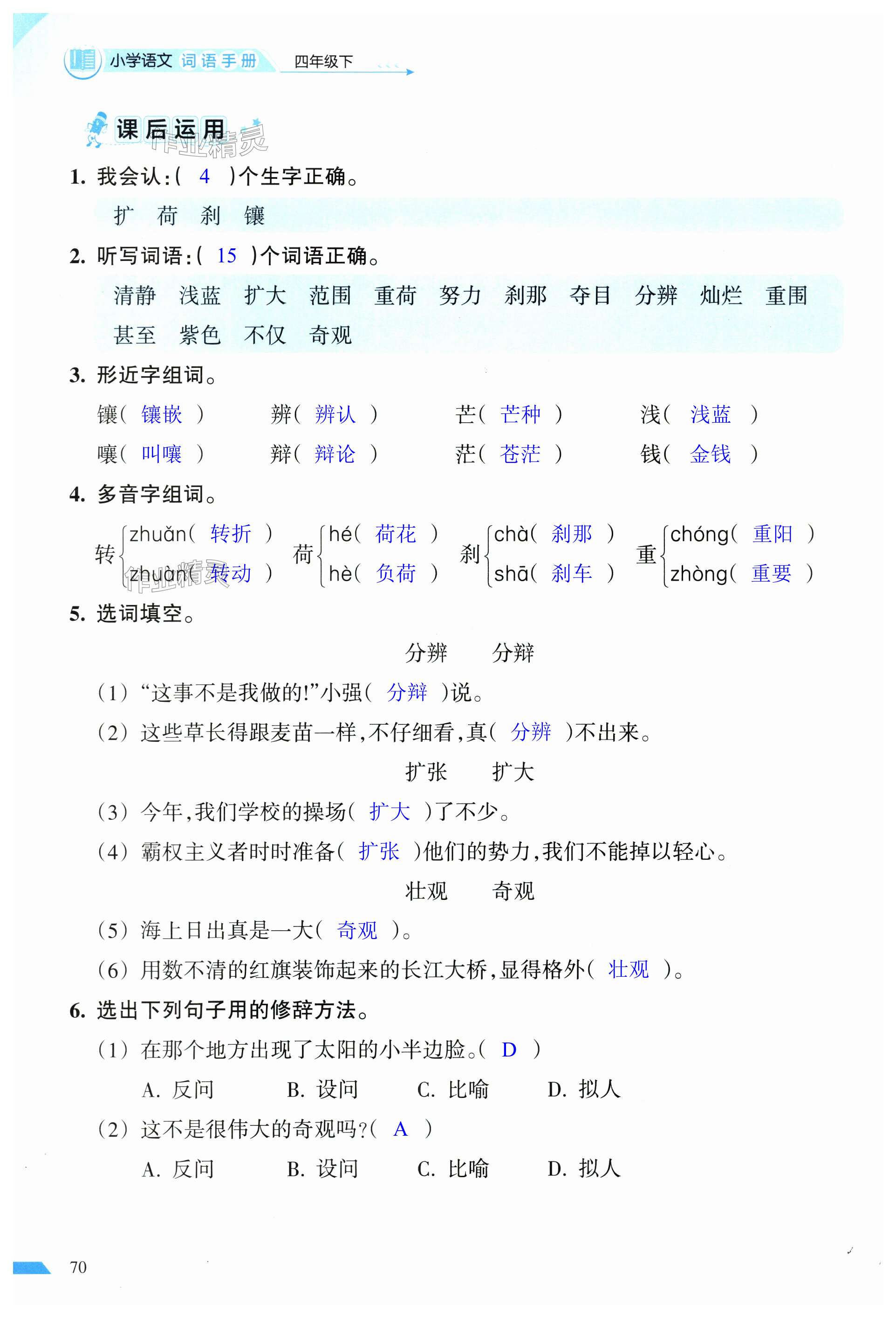 注:目前有些书本章节名称可能整理的还不是很完善,但都是按照顺序排列的,请同学们按照顺序仔细查找。练习册 2024年小学语文词语手册四年级下册人教版开明出版社 答案主要是用来给同学们做完题方便对答案用的,请勿直接抄袭。